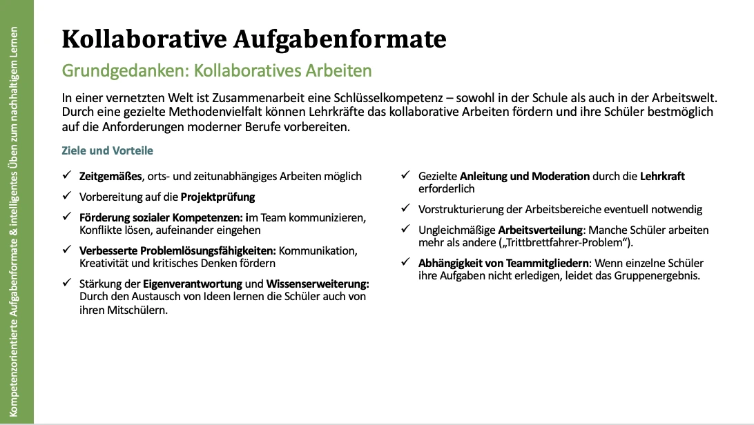 Durch die Kombination von kooperativem Lernen und digitalen Medien wird das Lernfeld für die Lernenden erheblich vergrößert. Neben dem fachlichen und sozialen Lernen bietet sich ihnen in jedem Fall die Gelegenheit, die eigenen Anwendungskompetenzen im Umgang mit digitalen Werkzeugen zu erweitern und mithilfe digitaler Werkzeuge die Organisation von kooperativen Arbeitsphasen zu erlernen.