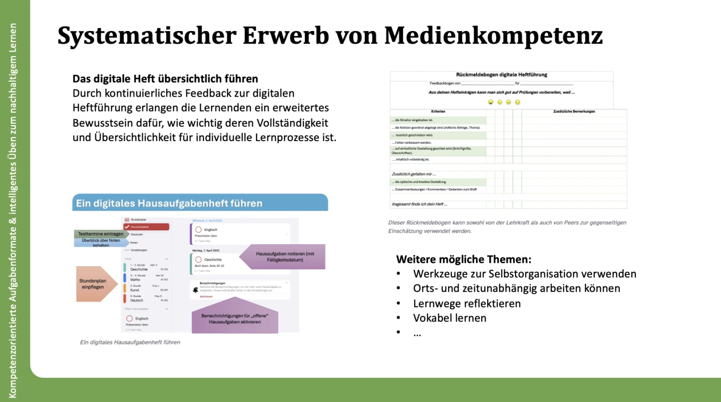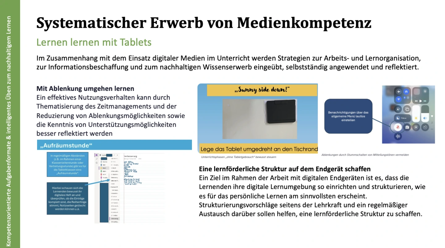 Im Zusammenhang mit dem Einsatz digitaler Medien im Unterricht werden Strategien zur Arbeits- und Lernorganisation, zur Informationsbeschaffung und zum nachhaltigen Wissenserwerb eingeübt, selbstständig angewendet und reflektiert.