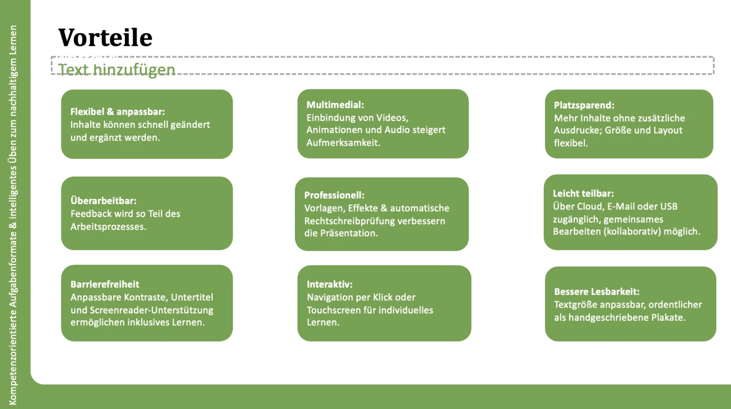 Digitale Medien eröffnen eine Vielfalt an Lernprodukten und -formaten, die gezielt unterschiedliche Kompetenzen ansprechen und fördern. Sie eröffnen Lehrkräften die Möglichkeit, Aufgabenformate zu entwickeln, die sowohl individuelles als auch kooperatives Lernen durch flexible Zugänge und differenzierte Angebote wirkungsvoll unterstützen. Die unkomplizierte Überarbeitbarkeit digitaler Inhalte ermöglicht iterative Lernprozesse, welche Reflexion und kontinuierliche Optimierung fördern. Mithilfe individualisierten Feedbacks und vielfältiger Materialressourcen wird der Lernprozess zudem selbstständiger und zielgerichteter gestaltet. Auf diese Weise können Lehrkräfte medienproduktive Aufgaben gezielt gestalten, um den individuellen Lernbedürfnissen gerecht zu werden und eine effektive Kompetenzentwicklung zu unterstützen.