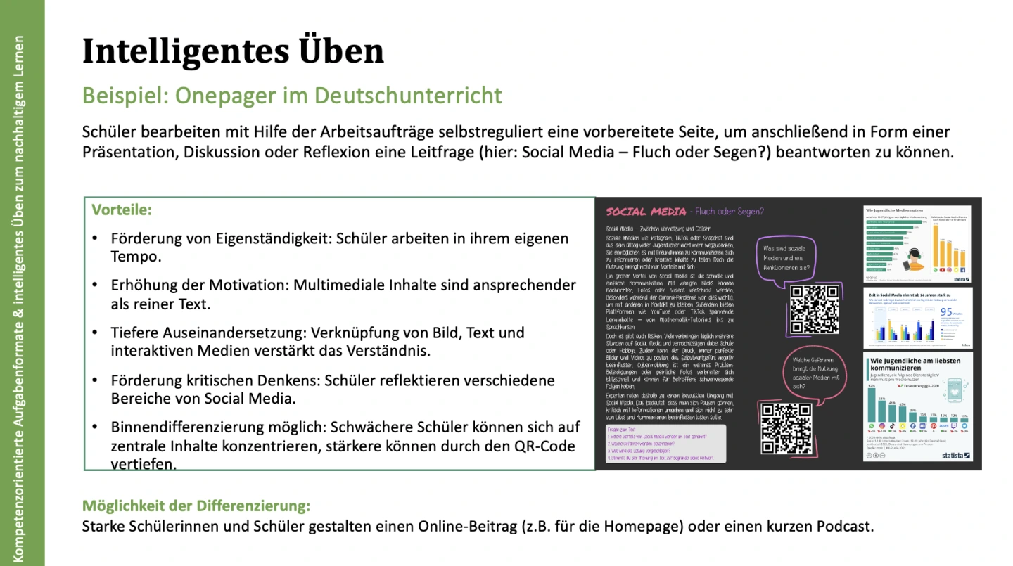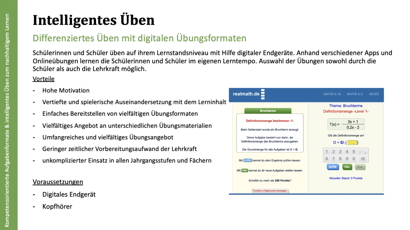 Digitale Plattformen ermöglichen es, eine Vielzahl an Übungsaufgaben orts- und zeitunabhängig bereitzustellen. Diese können beliebig oft wiederholt werden – ohne dass etwas ausradiert oder neu eingetragen werden muss. Lernende sind dadurch nicht mehr darauf angewiesen, bestimmte Hefte oder Bücher griffbereit zu haben, etwa auf dem Weg zur Schule im Bus, sondern haben jederzeit Zugang zu vielfältigen Übungsmöglichkeiten. Wissenslücken lassen sich so gezielter und schneller schließen, insbesondere durch den kontinuierlichen Zugriff auf grundlegende Übungen. Dies fördert das selbstständige Lernen außerhalb des Unterrichts und ermöglicht den schnellen Zugriff auf Basisübungen, um Wissenslücken zu schließen.