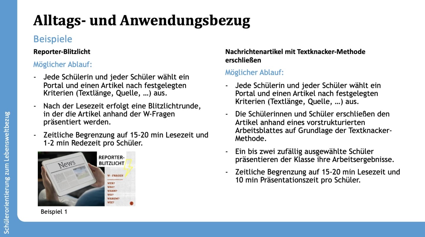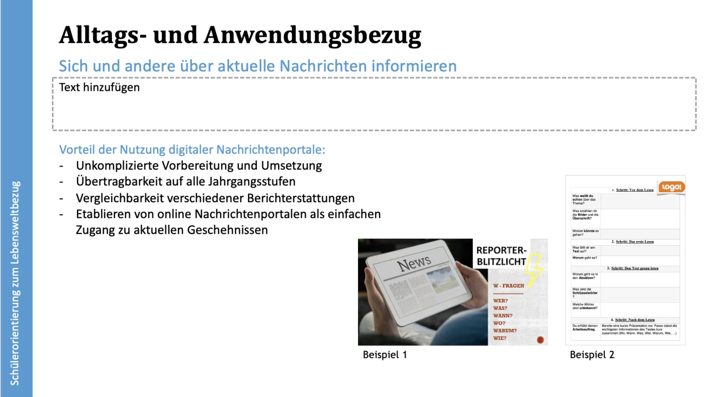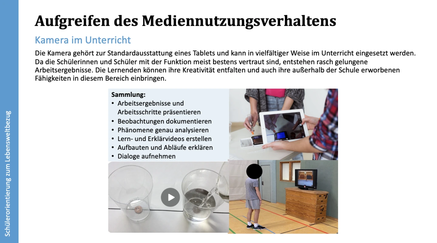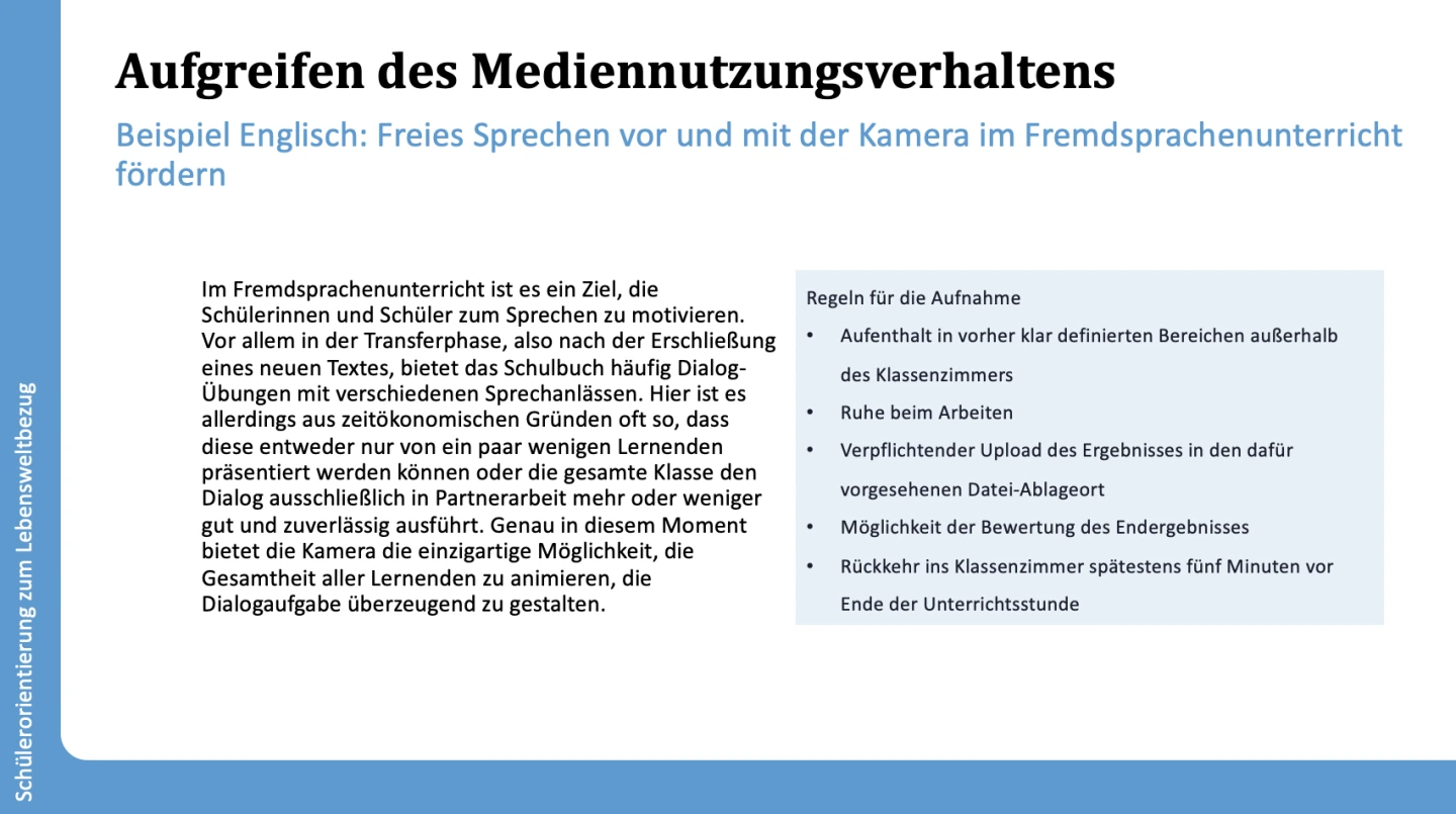Die Integration vielfältiger Medienformate, wie beispielsweise Videos, Podcasts oder Blogs, ermöglicht es den Schülerinnen und Schülern, ihre Kreativität auszudrücken und verschiedene Kompetenzen zu entwickeln. Die sich daraus ergebenden Gesprächsanlässe bieten die Möglichkeit, das alltägliche Medienverhalten der Lernenden zu reflektieren. Dabei können auch Themen wie exzessive Mediennutzung und die dahinter stehenden Bedürfnisse thematisiert und vertieft werden.