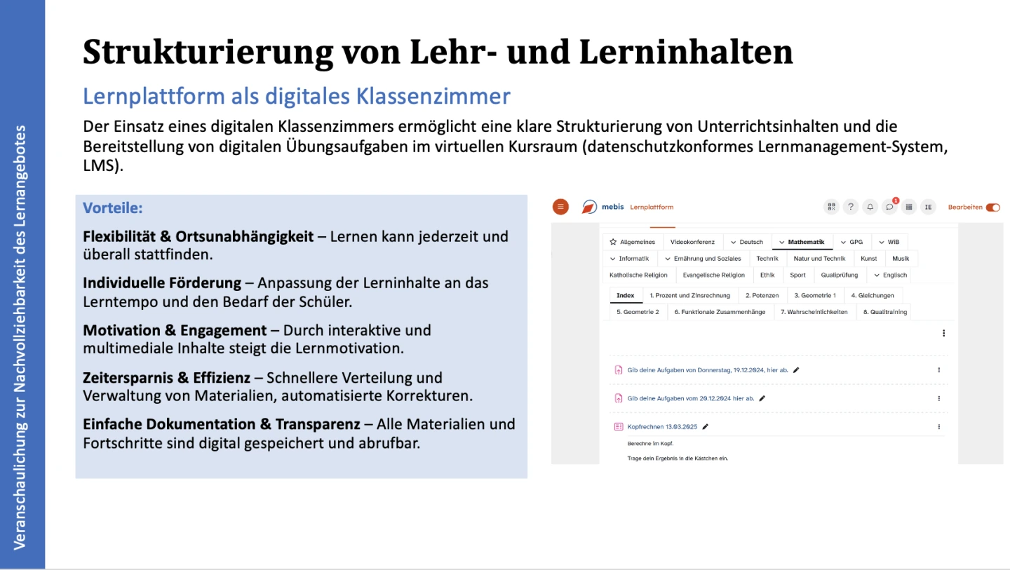 Lehrkräfte können sämtliche Materialien zur Unterrichtsstunde (z. B. zur Inhaltserarbeitung oder Übungsblätter) auf einer Lernplattform bereitstellen, sodass diese über die Unterrichtszeit hinaus dauerhaft zugänglich sind.