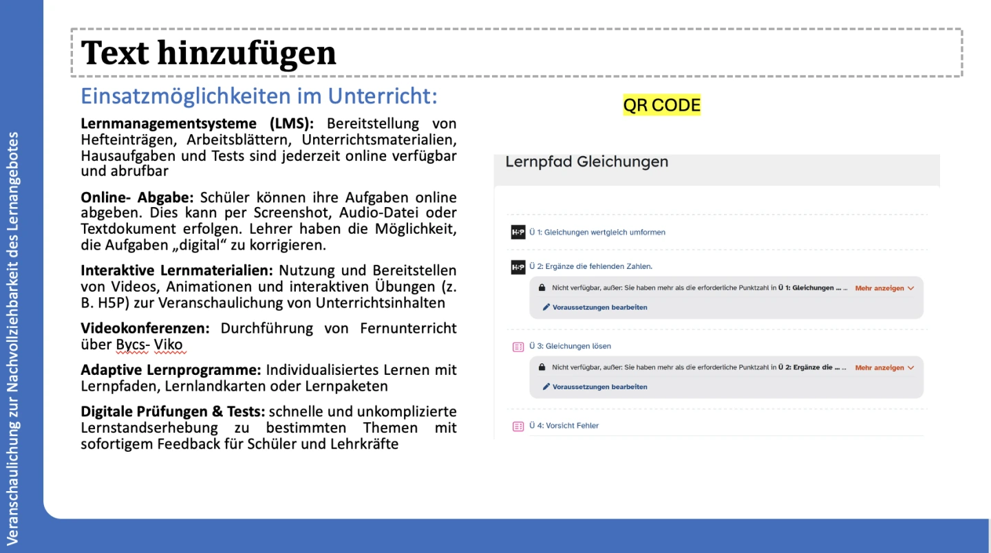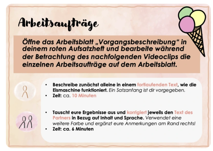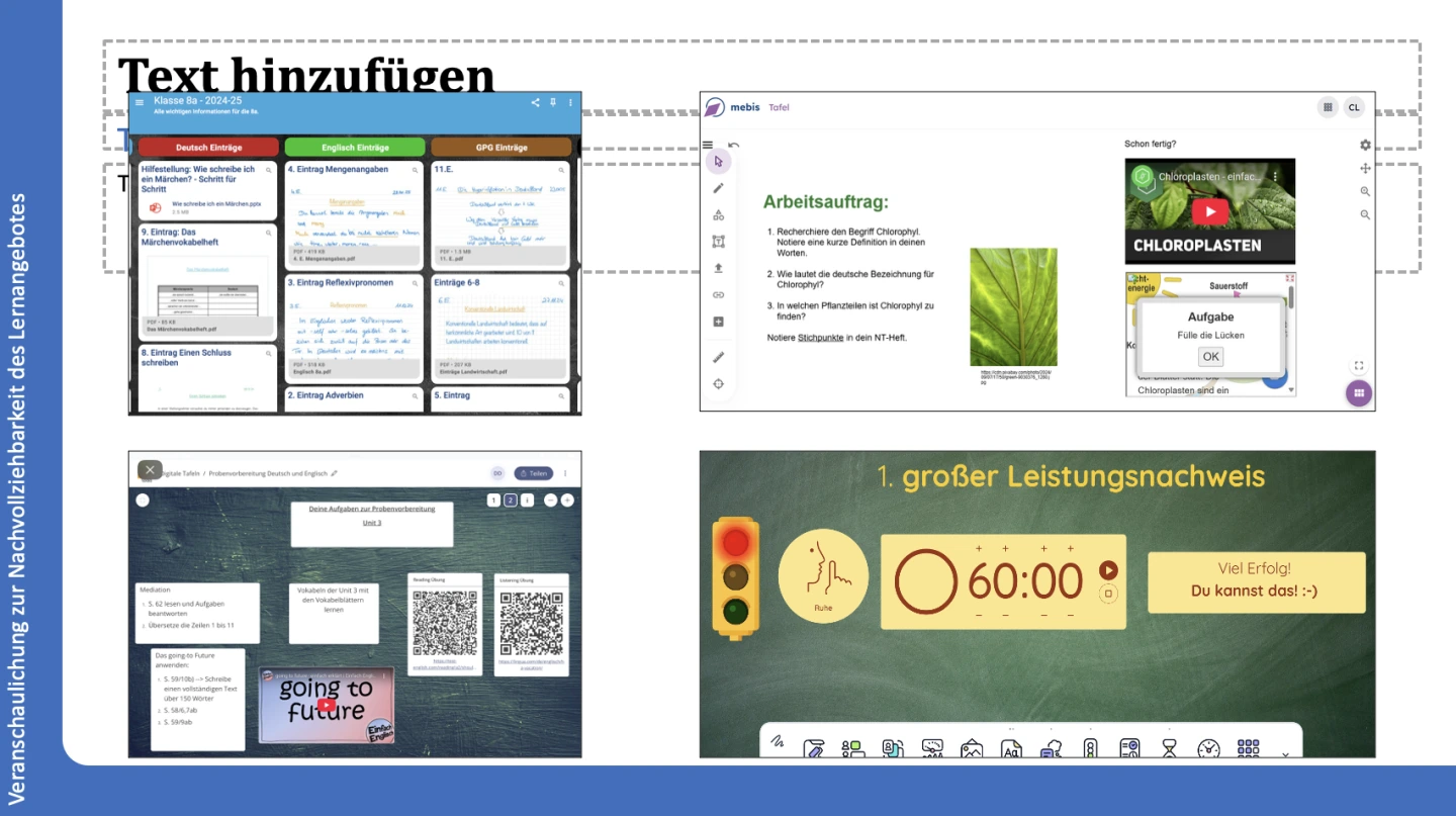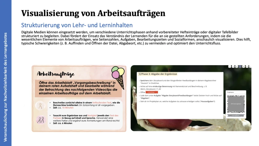 Visualisierung von Arbeitsaufträgen: Digitale Medien fördern das Verständnis der Lernenden für die an sie gestellten Anforderungen, indem sie die wesentlichen Elemente von Arbeitsaufträgen, wie Seitenzahlen, Aufgaben, Bearbeitungszeiten und Sozialformen, anschaulich visualisieren. Dies hilft, typische Schwierigkeiten (z. B. Auffinden und Öffnen der Datei, Abgabeort, etc.) zu vermeiden und optimiert den Unterrichtsfluss.