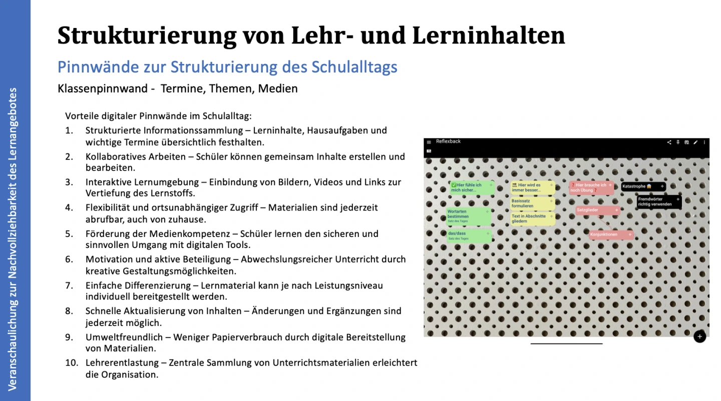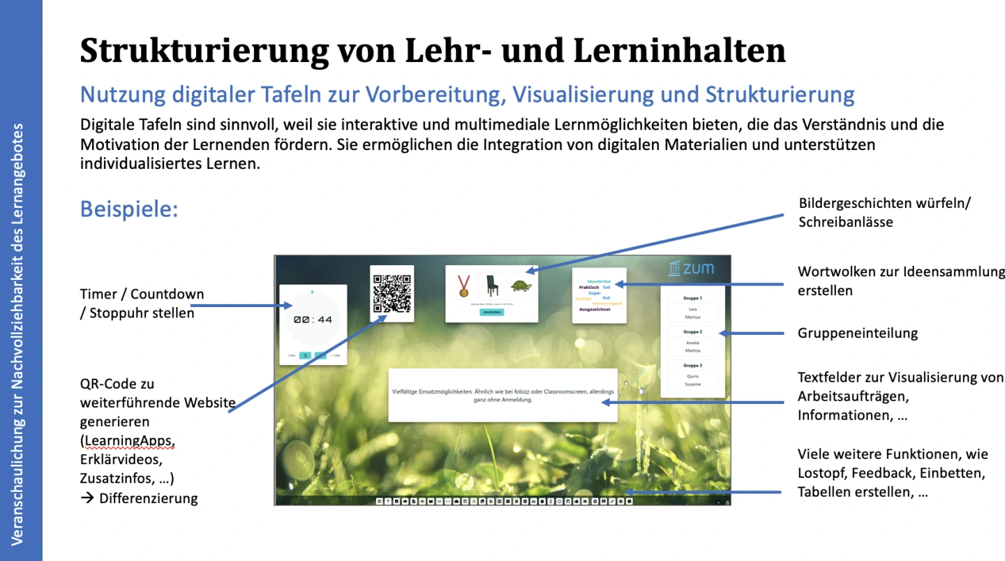 Mithilfe digitaler Anwendungen, wie Lernplattformen, Pinnwänden oder interaktiven Arbeitsblättern, können unterschiedliche Materialien – darunter Audios, Videos, PDF-Dateien, bearbeitbare Tabellen, externe Links und Arbeitsanweisungen – strukturiert bereitgestellt werden. Digitale Medien können auch eingesetzt werden, um verschiedene Unterrichtsphasen anhand vorbereiteter Hefteinträge oder digitaler Tafelbilder strukturiert zu begleiten.