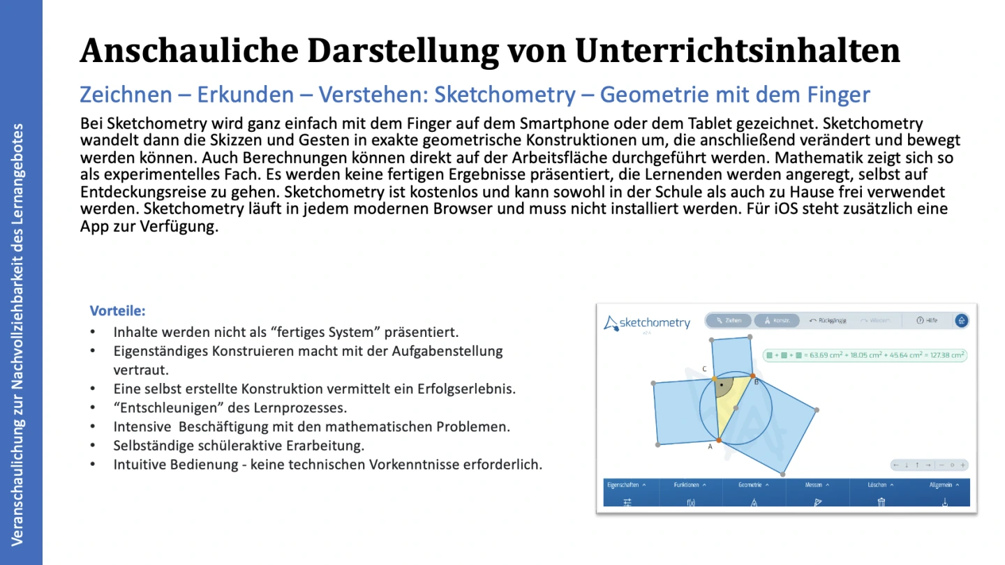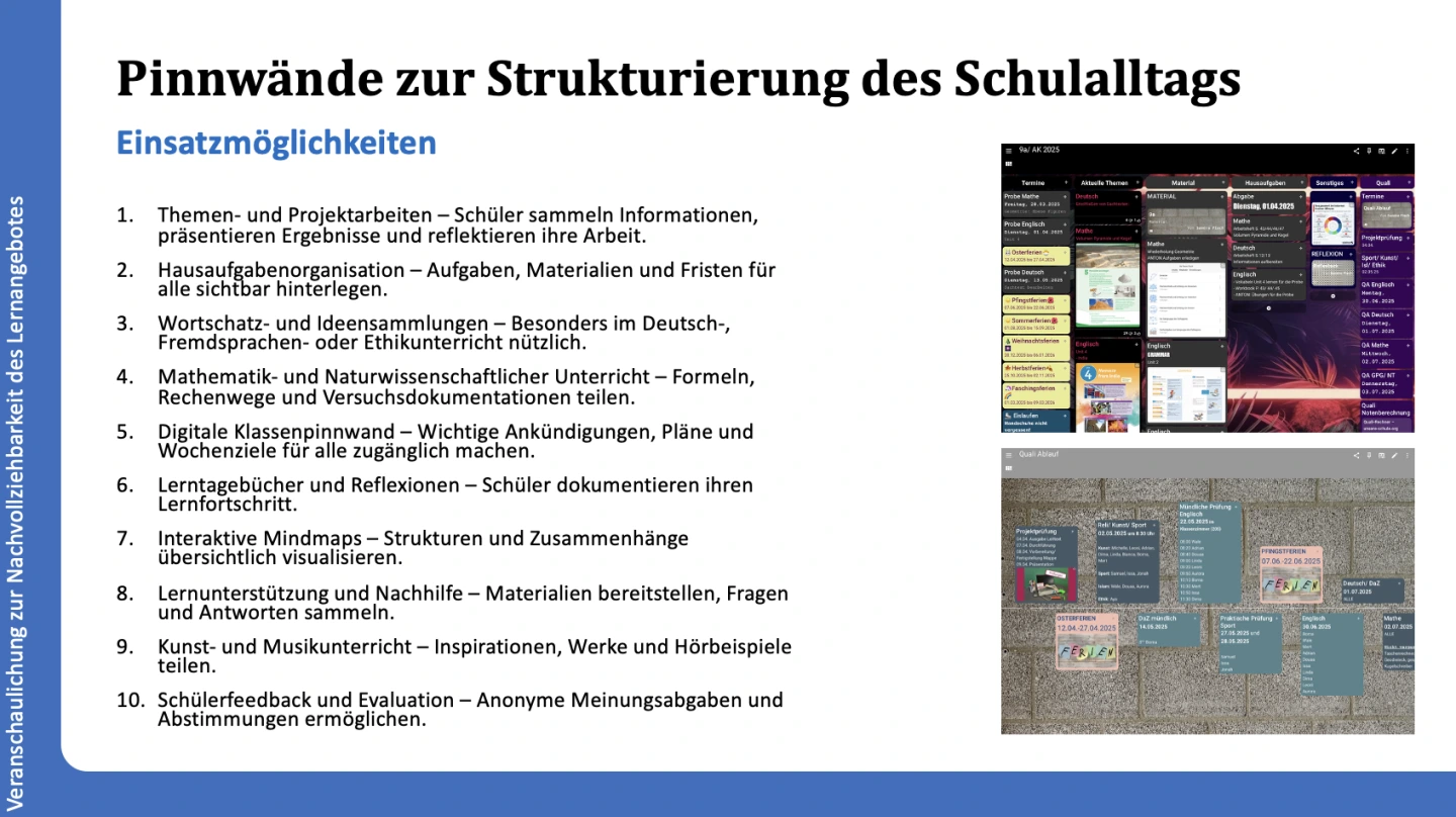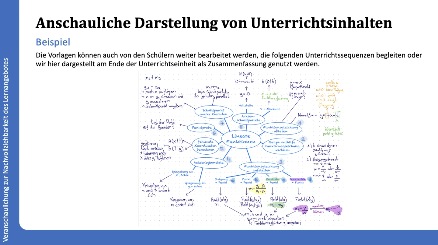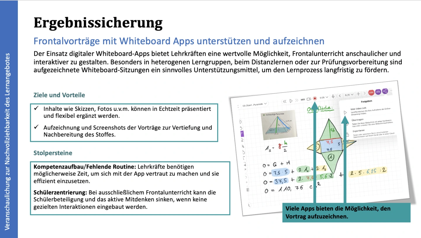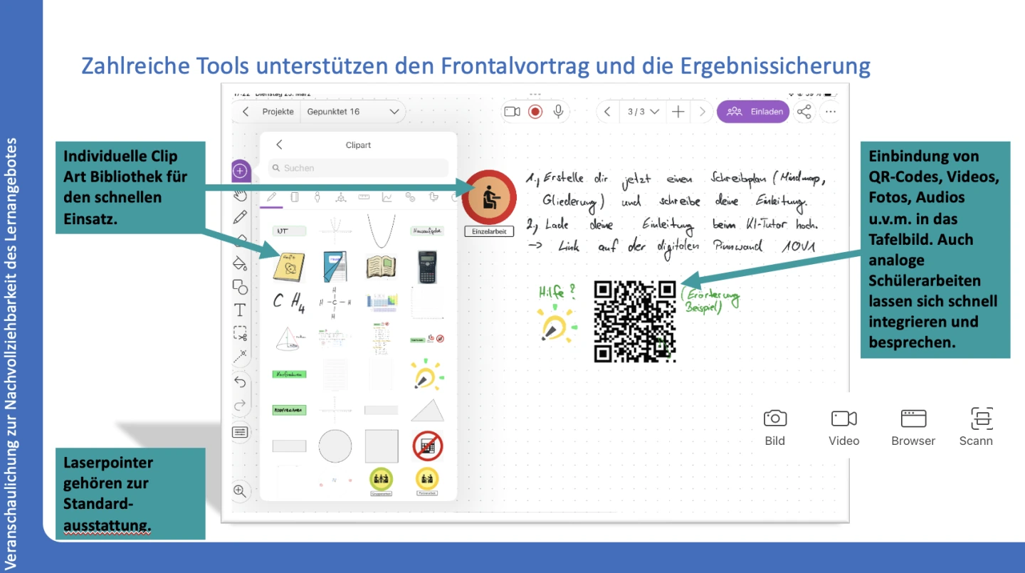 Unterrichtsinhalte und Lernergebnisse lassen sich übersichtlich festhalten, flexibel erweitern und dauerhaft dokumentieren. Sie können jederzeit wieder aufgegriffen werden, was die Wiederholung und Vertiefung von Lerninhalten sowohl im weiteren Unterrichtsverlauf als auch bei der individuellen Nachbereitung erleichtert.