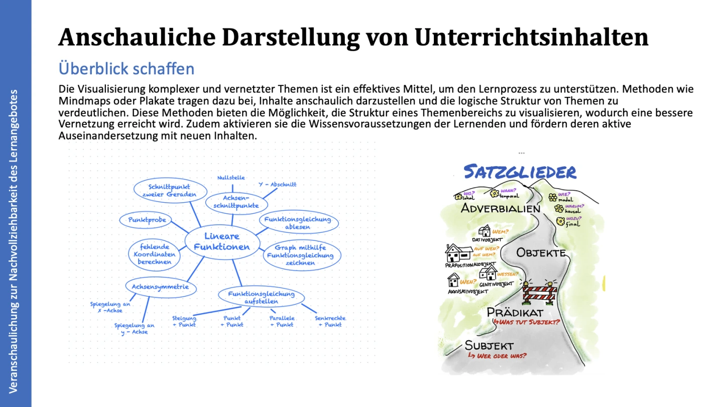 Visualisierung komplexer und vernetzter Themen: Die Visualisierung komplexer und vernetzter Themen ist ein effektives Mittel, um den Lernprozess zu unterstützen. Methoden wie Mindmaps und interaktive Datenvisualisierungen tragen dazu bei, Inhalte anschaulich darzustellen und die logische Struktur von Themen zu verdeutlichen. Grafische Strukturierungsformen ermöglichen es den Lernenden, Sachinhalte eigenständig zu erarbeiten und die Beziehungen zwischen verschiedenen Konzepten zu erkennen. Diese Methoden bieten die Möglichkeit, die Struktur eines Themenbereichs zu visualisieren, wodurch eine bessere Vernetzung erreicht wird. Zudem aktivieren sie die Wissensvoraussetzungen der Lernenden und fördern deren aktive Auseinandersetzung mit neuen Inhalten.