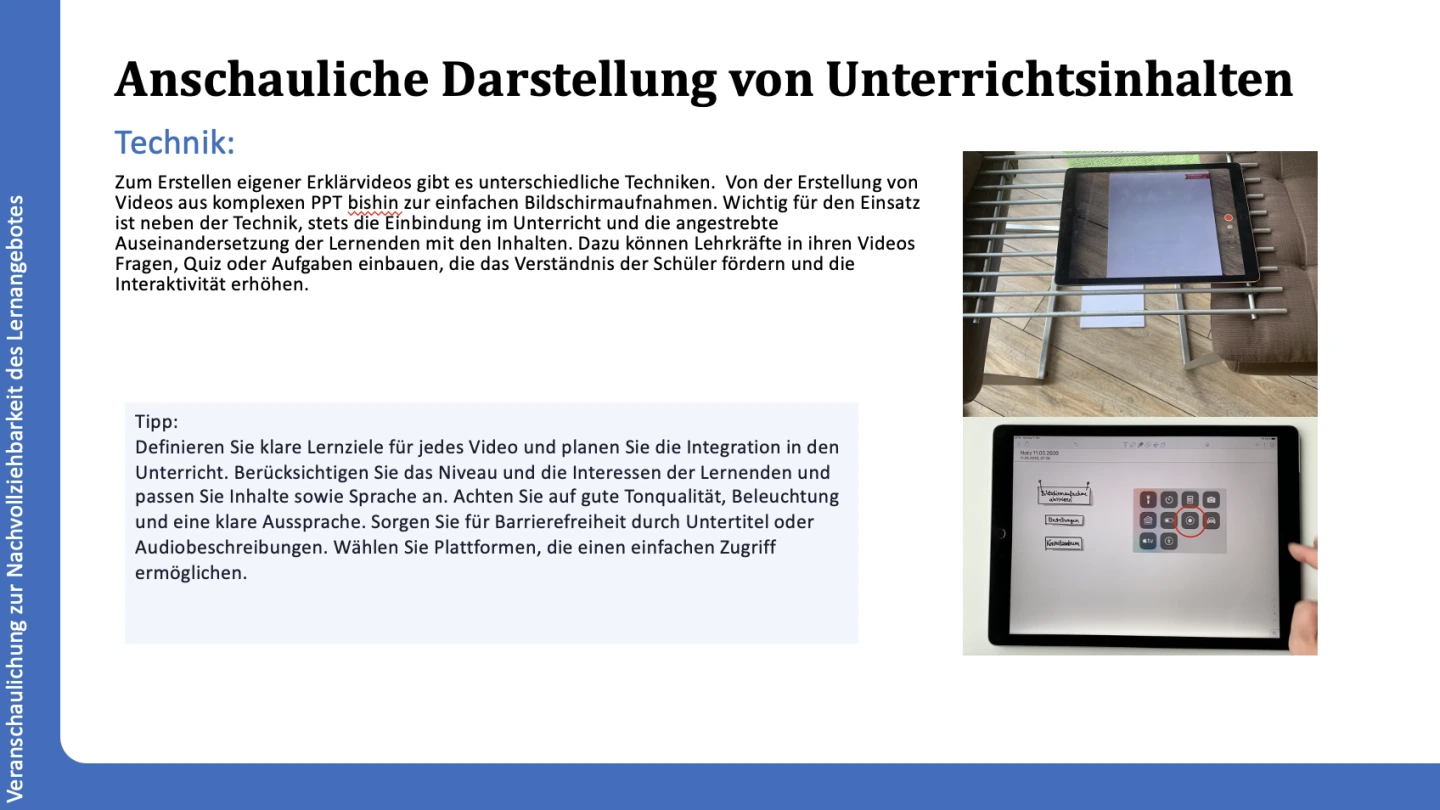 Erklärvideos: Erklärvideos bieten eine vielseitige Möglichkeit, Unterrichtsinhalte zu vermitteln und zu vertiefen. Sie können zur Veranschaulichung (komplexer) Themen genutzt werden, indem sie visuelle und auditive Elemente kombinieren, die das Verständnis fördern. Die nachvollziehbare Abbildung des Prozesses ist ergänzend zu traditionellen Lehrmethoden, bietet zusätzliche Perspektiven und Erklärungsmöglichkeiten. Schließlich sind sie eine wertvolle Ressource zur häuslichen Nachbereitung des Unterrichtsinhalts, da Schülerinnen und Schüler die Möglichkeit haben, in ihrem eigenen Tempo zu lernen, schwierige Themen zu wiederholen und das Gelernte zu festigen.