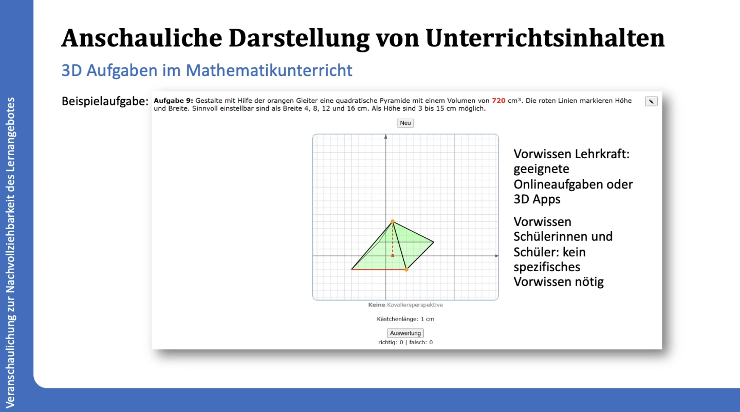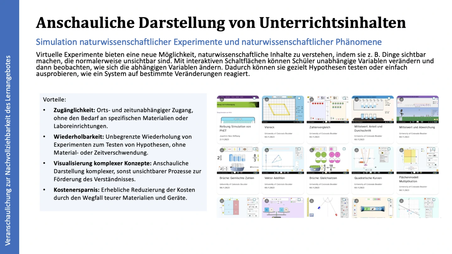 Nachvollziehbarkeit komplexer Zusammenhänge durch Simulationen und interaktive Modelle: Simulationen, Visualisierungen und interaktive Modelle machen komplexe Zusammenhänge anschaulich, indem sie Veränderungen sichtbar und nachvollziehbar machen. Sie unterstützen das Lernen durch aktive Erkundung und das direkte Beobachten von Prozessen in Echtzeit.