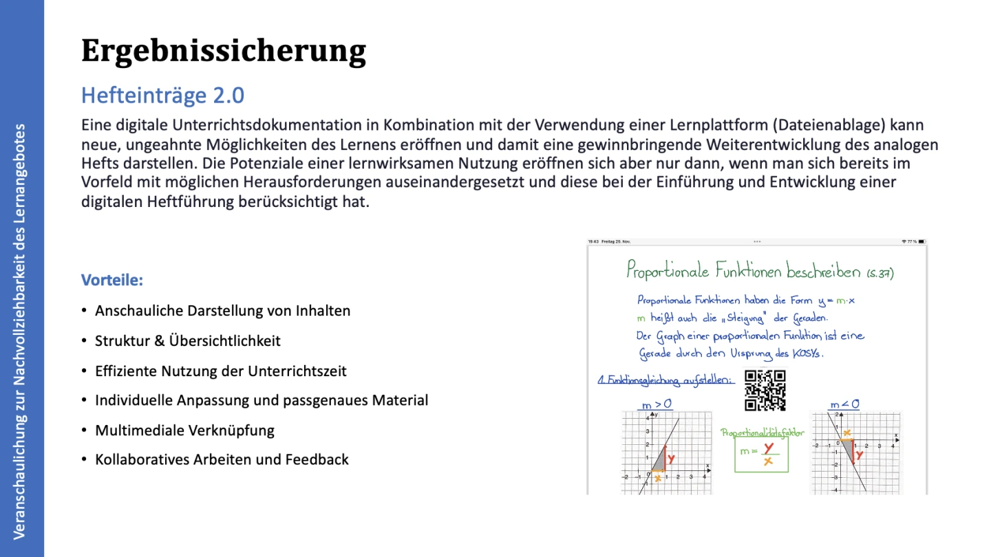 Weiterentwicklung des analogen Hefts in Verbindung mit einer Lernplattform: Eine digitale Unterrichtsdokumentation in Kombination mit der Verwendung einer Lernplattform oder Dateiablage kann eine gewinnbringende Weiterentwicklung des analogen Hefts darstellen und die Nachbereitung der Unterrichtsinhalte lernförderlich unterstützen.