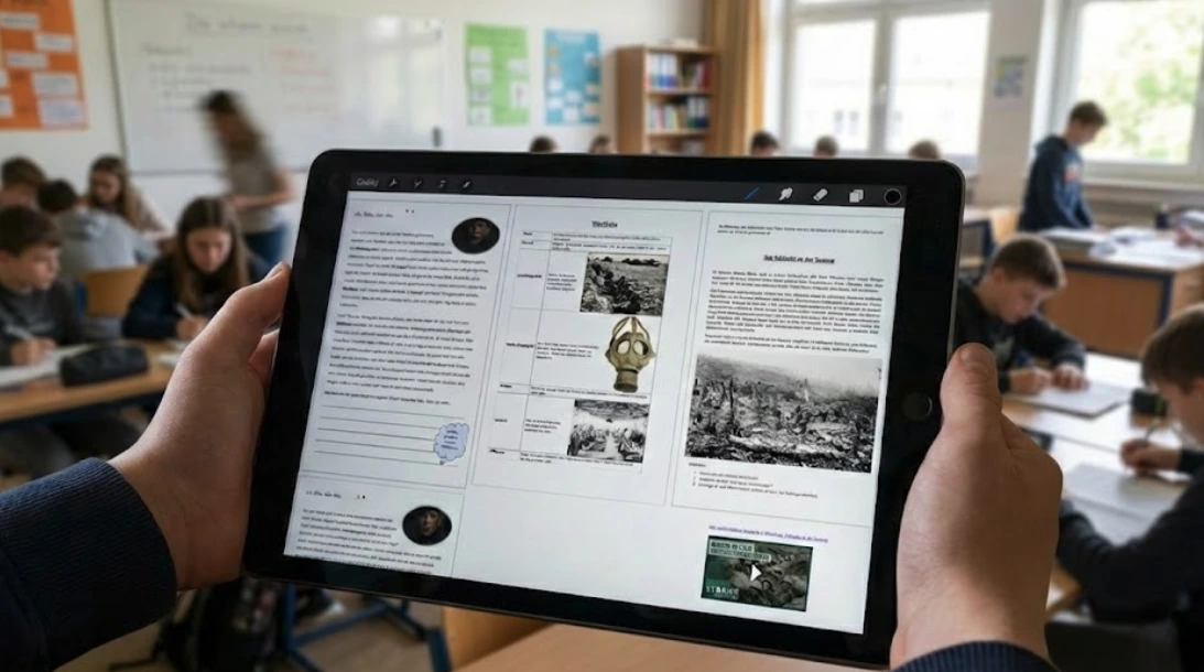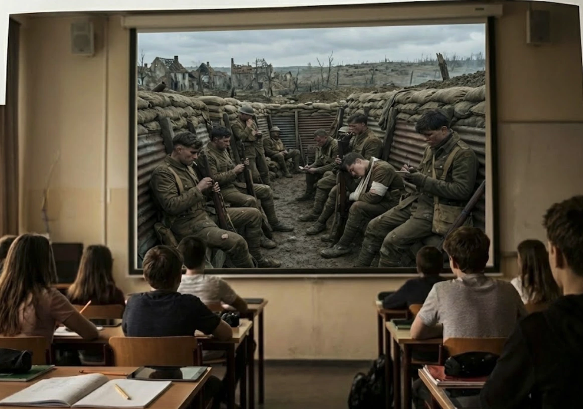 Die Klasse betrachtet einen Filmausschnitt, der das Leben an der Front thematisiert. Diese multimediale Veranschaulichung weckt unmittelbar Emotionen und lenkt die Aufmerksamkeit auf den zentralen Lerngegenstand der Unterrichtseinheit. Der audiovisuelle Zugang durch das Medium Film erleichtert den Lernenden die für das Fach GPG essenzielle Perspektivenübernahme. (Symbolbild. Erstellt mit ByLKI-Gemini) -