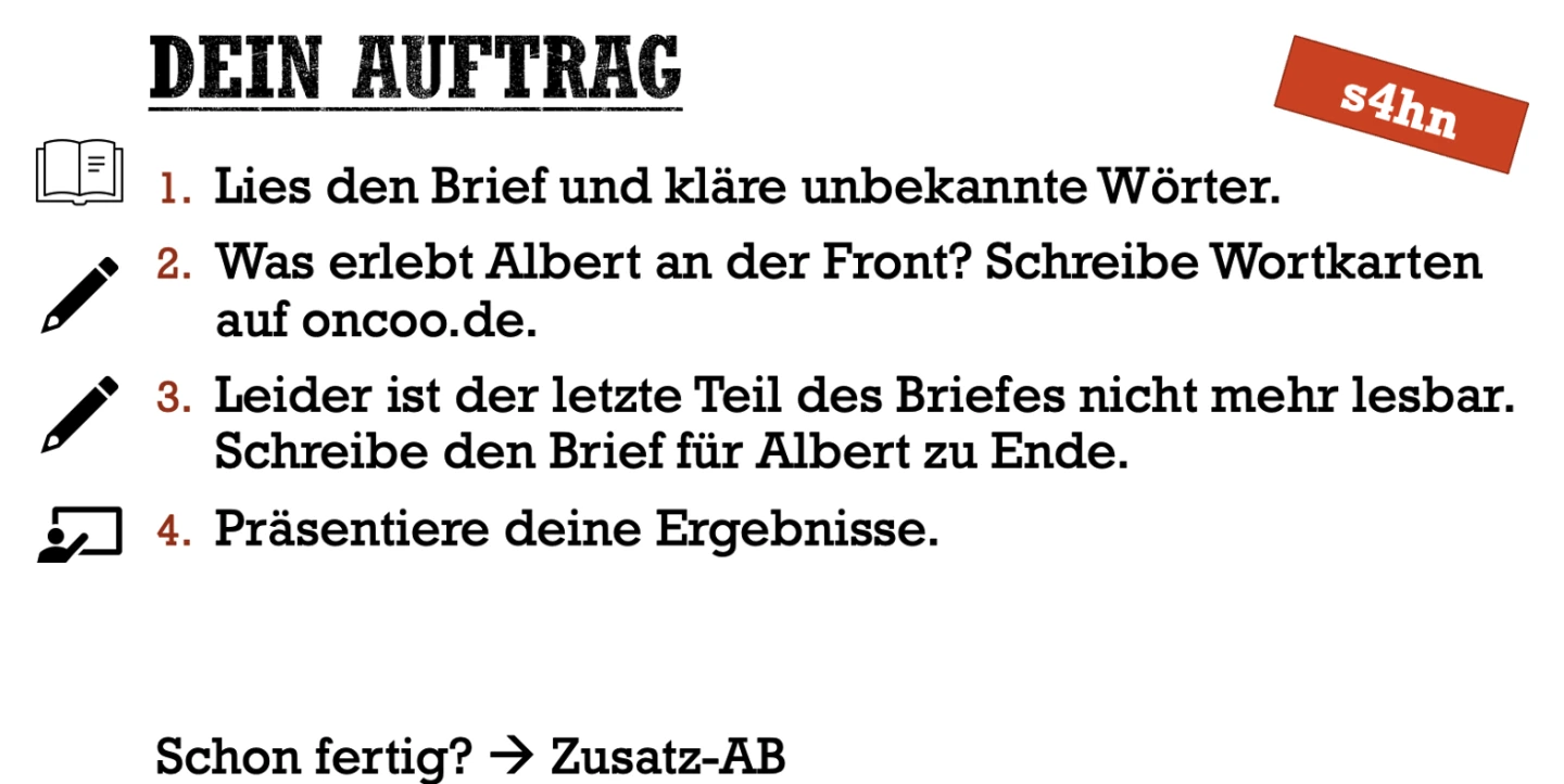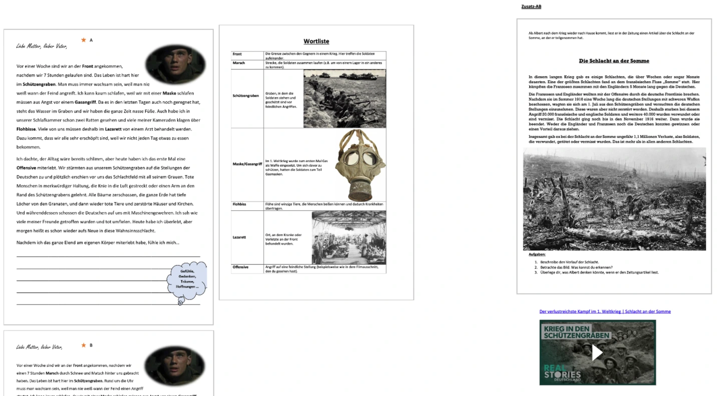 In der Arbeitsphase greifen die Lernenden auf alle notwendigen Materialien in ihrem digitalen Heft zu. Die Lernumgebung enthält den historischen Feldpostbrief in dreifacher Differenzierung sowie unterstützende Elemente wie eine Wortliste und ein Erklärvideo. Die Schülerinnen und Schüler arbeiten in ihrem eigenen Tempo und greifen bei Bedarf auf die Hilfestellungen zu. Gleichzeitig werden durch die multimediale Veranschaulichung unterschiedliche Lernkanäle angesprochen. Die strukturierte digitale Materialausgabe verhindert organisatorische Leerläufe und schafft der Lehrkraft den nötigen Freiraum, um z.B. als Lernbegleitung gezielt dort zu unterstützen, wo individuelle Hilfe benötigt wird. CC BY-SA 4.0 (Ausschnitt des digitalen Heftes, erstellt von S. Luff) -