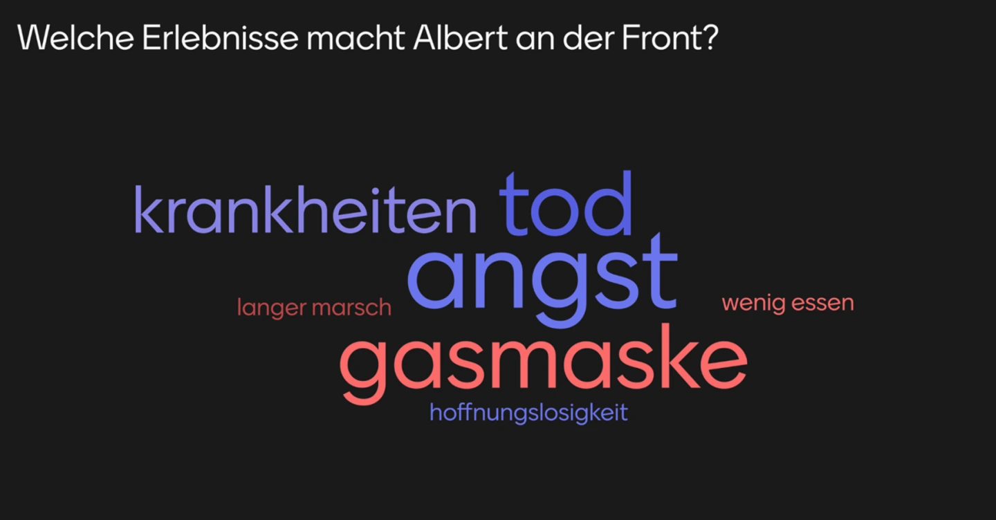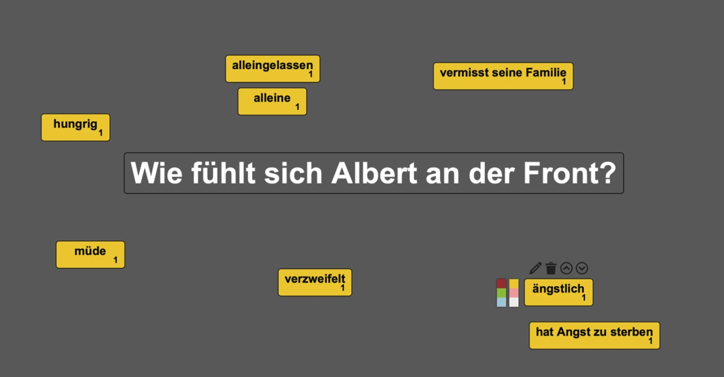 In der Reflexionsphase verarbeiten die Lernenden die emotional fordernden Eindrücke der Unterrichtsstunde. Um eine altersangemessene historische Distanz zu wahren, reflektieren sie aus der Beobachterperspektive, wie sich der Frontalltag auf den Soldaten auswirkt. Die gesammelten Eindrücke werden über digitale Wortkarten gebündelt. Diese Veranschaulichung strukturiert das sensible Unterrichtsgespräch visuell. Zugleich lässt sich das entstehende, digitale Tafelbild im Gespräch flexibel anpassen und zur nachhaltigen Sicherung unkompliziert als Bilddatei exportieren. © oncoo.de / erstellt von S. Luff