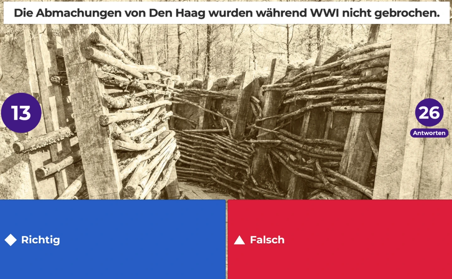 Zur Festigung der erarbeiteten Inhalte zum Frontalltag absolvieren die Lernenden ein digitales Quiz auf ihren Endgeräten. Dies motiviert durch den interaktiven Charakter und liefert allen ein sofortiges Feedback zum eigenen Wissensstand. Zugleich erfasst die Lehrkraft auf eine effiziente Weise den Lernzuwachs der Klasse, kann situativ nachsteuern sowie bei Bedarf die folgenden Unterrichtseinheiten anpassen. © kahoot.com / Quiz erstellt von S. Luff -