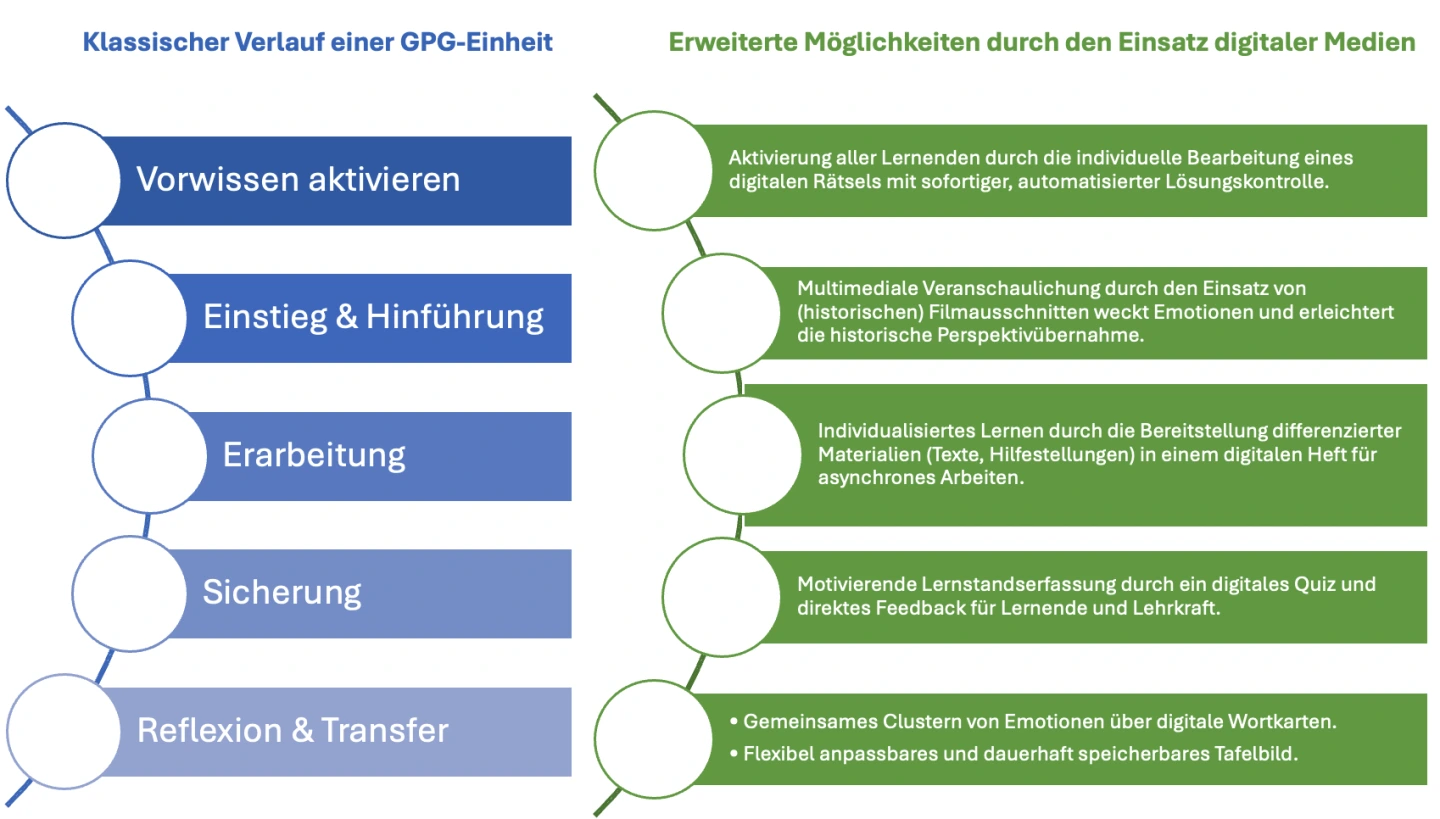 Sorgfältig aufbereitete, leicht zugängliche digitale Materialien, kombiniert mit etablierten Routinen und vorab eingeübten Bedienkompetenzen, fördern einen effektiven Unterrichtsablauf und eine kontinuierliche Auseinandersetzung mit den Lerninhalten.
