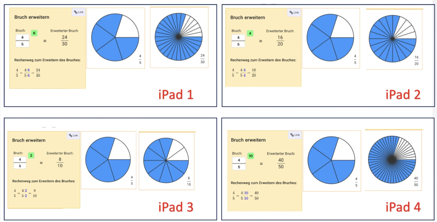 Nach der Begrüßung präsentiert die Lehrkraft die Brüche an der Tafel und stellt die Impulsfrage „Was haben diese Brüche gemeinsam?“ Die Lehrkraft zieht die Brüche in die richtige Position und ergänzt die Zusammenhänge. Der Einsatz einer digitalen Notiz-App für Tafelbilder bietet im Vergleich zum traditionellen Kreide- oder Whiteboard-Tafelbild zahlreiche Vorteile, die den Unterricht dynamischer, nachhaltiger und inklusiver gestalten.