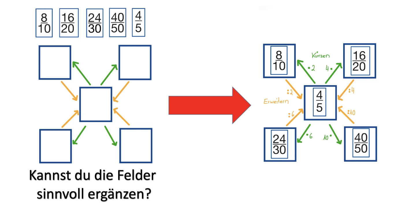 Die Stunde steht am Anfang der Sequenz und wiederholt das Erweitern und Kürzen von Brüchen.
