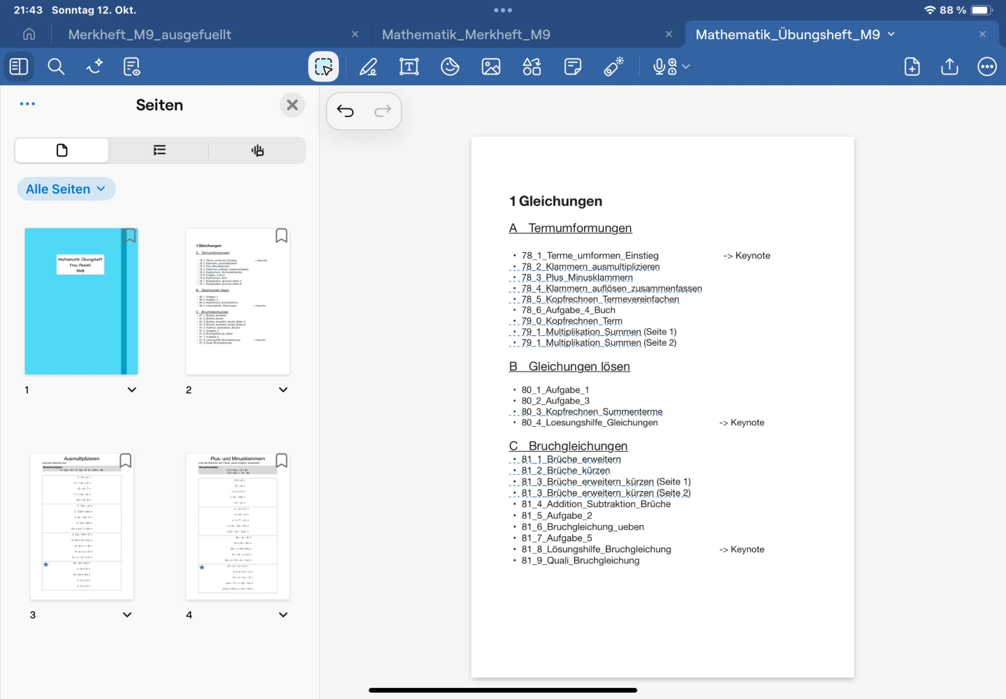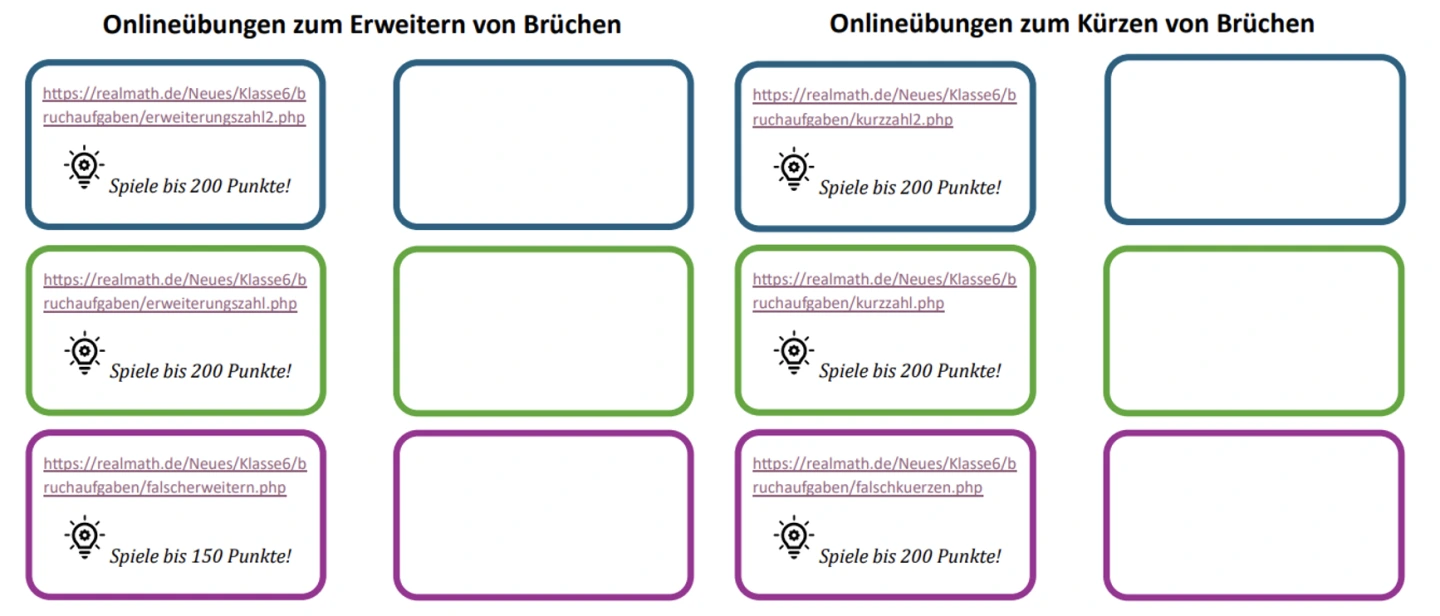 Material: Arbeitsblatt in einer Notizapp mit Verlinkung zu den Onlineübungen