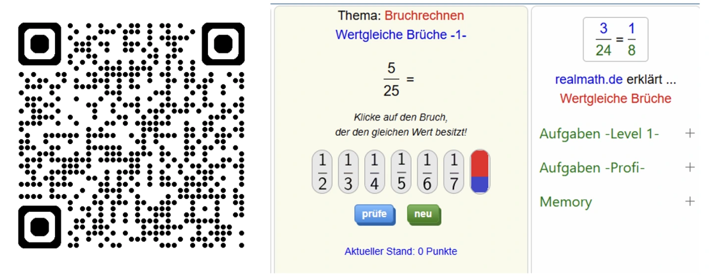Aktivität: Die Lehrkraft zeigt eine Beispielaufgabe. Die Schülerinnen und Schüler besprechen mit dem Partner die mögliche Lösungsstrategie. Anschließend scannen die Schülerinnen und Schüler den QR Code. Wer schafft innerhalb eines festgelegten Zeitlimits die meisten Punkte?