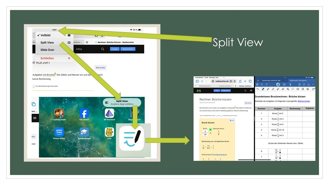 Die Lernenden bearbeiten die beiden Arbeitsblätter im Split Screen Modus. Während die Kinder die Übung selbstständig erledigen, hat die Lehrkraft Zeit auf individuelle Fragen einzugehen und kontrolliert, ob Rechenwege sauber und mathematisch korrekt mit eingeübt werden. -