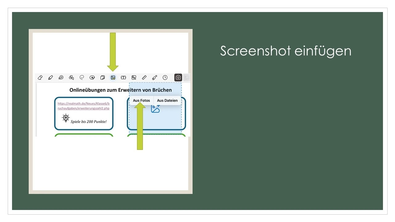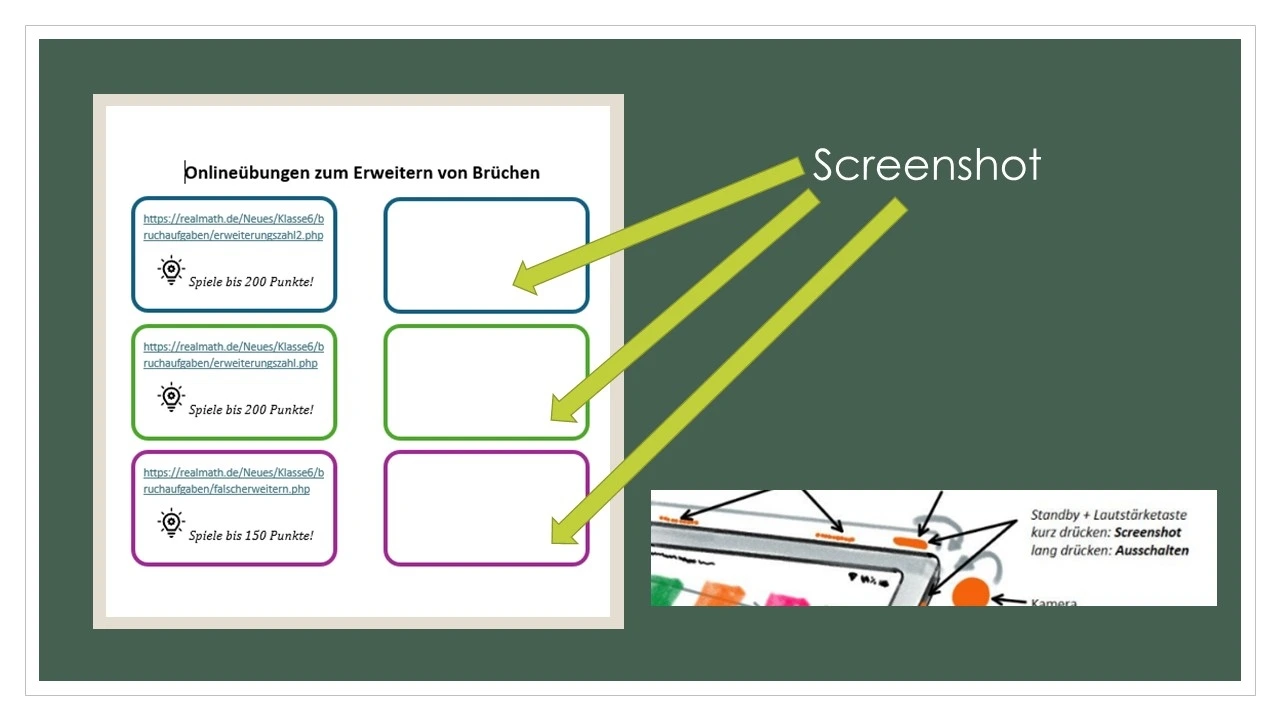 Aktivität: Die Schüler bearbeiten die gestellten Aufgaben, indem sie die Onlineübungen bis zur gewünschten Punktzahl bearbeiten. Als Nachweis fügen sie einen Screenshot in das digitale Arbeitsblatt ein