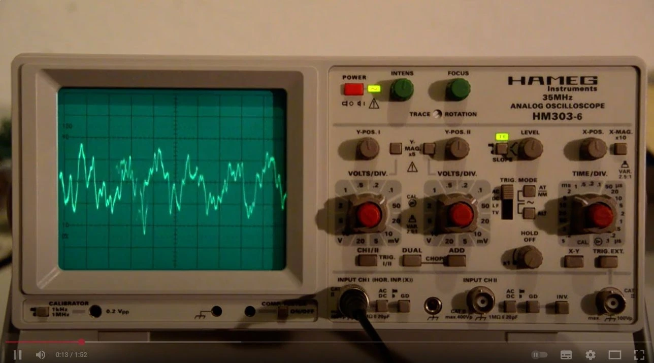 Die SuS sehen erneut ein Video, dass ein Oszilloskop zeigt, während ein klassisches Lied spielt. Hierbei können sie deutlich die unterschiedliche Geschwindigkeit der Schwingungen sowie die Häufigkeit der Schwingungen erkennen und sie noch einmal in Zusammenhang mit der Tonhöhe bringen. Außerdem gibt das Oszilloskop einen Einblick in das nächste Stundenthema, denn laute Töne erkennen sie direkt als Ausschlag des Graphen. Quelle: https://www.youtube.com/watch?v=tdznHHik80g -