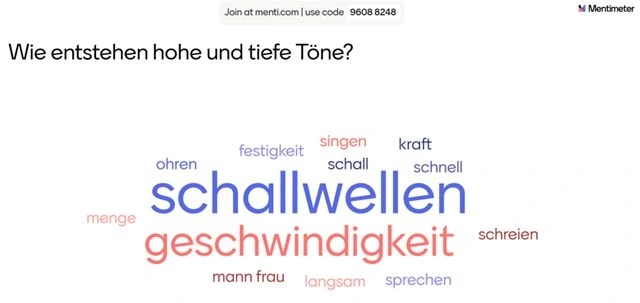 In der Präsentation wird ein Zahlen-Code angezeigt, den die Schülerinnen und Schüler auf der entsprechenden Webseite eingeben müssen. So gelangen sie zu einer Übersichtsseite, auf der sie ihre Vermutungen eintragen können. Diese Eingaben werden in Echtzeit in einer Wortwolke visualisiert: Je häufiger ein Begriff genannt wird, desto größer erscheint er. Die Wortwolke kann anschließend gemeinsam betrachtet und besprochen werden. Quelle: https://www.mentimeter.com/de-DE