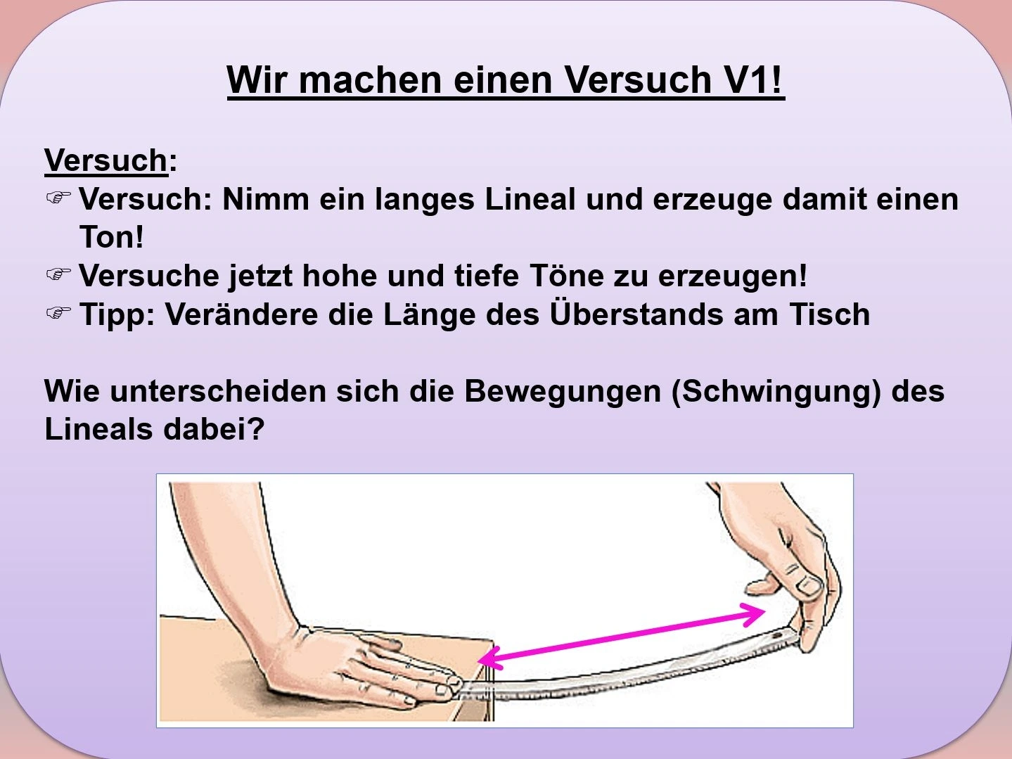 Aktivität: SuS machen einen Versuch, bei dem sie selbst Schwingungen mit einem Lineal erzeuge. Je kürzer der überstehende Teil des Lineals, desto höher die Frequenz und damit der Ton.