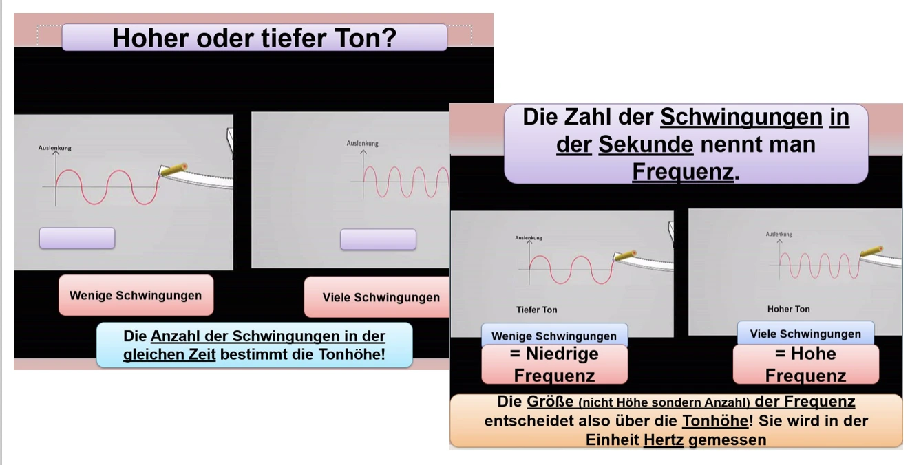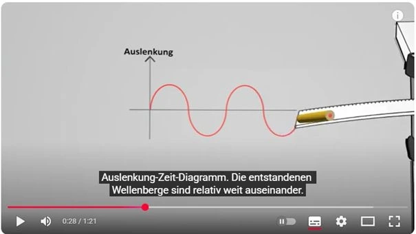 Quelle: https://www.youtube.com/watch?v=Ckv0ONFcbcM In der gleichen Präsentation wird nun ein Video eingeblendet. Dieses ‚übersetzt‘ den Schülerversuch in ein Auslenkung-Zeit-Diagramm, das zeigt, wie sich die Schwingungsfrequenz auf die Tonhöhe auswirkt. -