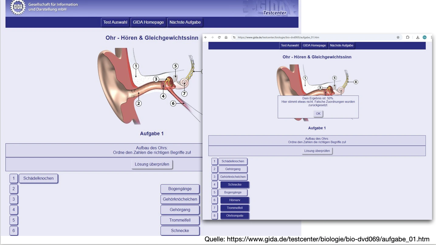 Nach der Begrüßung stellt die Lehrkraft die erste Aufgabe der selbstverbessernden Übung über die Projektionsfläche vor. In der Präsentation wird der QR-Code eingeblendet, der zur interaktiven Übung leitet. Da in der Vorstunde das Thema „Wie ist das Ohr aufgebaut und wie funktioniert es?“ behandelt wurde, können die Kinder die interaktive Übung selbstständig bearbeiten. Die sofortige Rückmeldung verhindert, dass eine Fehlvorstellung entsteht. Die Lehrkraft hat Zeit auf individuelle Fragen einzugehen. -