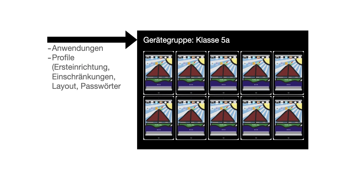 Ein MDM System kann für einen reibungslosen technischen Ablauf des Unterrichts sorgen, indem es eine bestimmte Anzahl von Geräten über Geräte- oder Nutzergruppen gleichzeitig administriert. Darüber können Apps verteilt, Anpassungen vorgenommen und Einschränkungen gesetzt werden. Bei schuleigenen Geräten empfiehlt es sich, Gerätegruppen zu nutzen, da hierbei keine personenbezogenen Daten nötig sind und mehr Spielraum bei Anpassungen und Einschränkungen besteht.