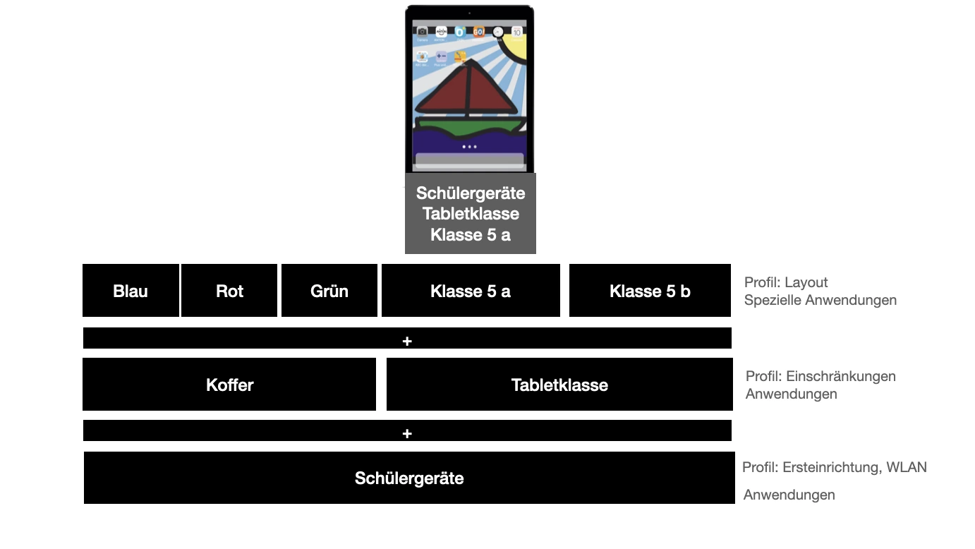 Ein einzelnes Gerät kann mehreren Gruppen angehören und dadurch mehrere Profile erhalten. Ein durchdachter Aufbau erleichtert die Wartung und Administration. Dabei unterstützen die Beraterinnen und Berater für digitale Bildung.