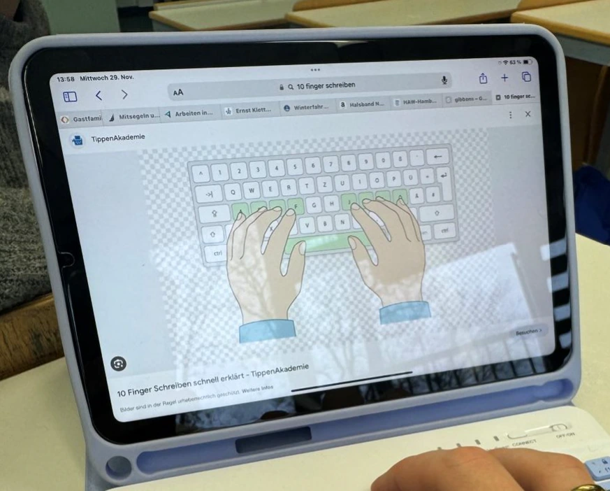 „Die externe Tastatur für mobile Endgeräten ist häufig kleiner als eine PC-Tastatur. Lernenden in den unteren Jahrgangsstufen fällt dadurch das Erlernen des Tastschreibens leichter, da die Buchstaben nicht so weit auseinander liegen. Auch das haptische Feedback und Finden des Druckpunktes auf einer Tastatur, unterstützt das Erlernen des Tastschreibens.“