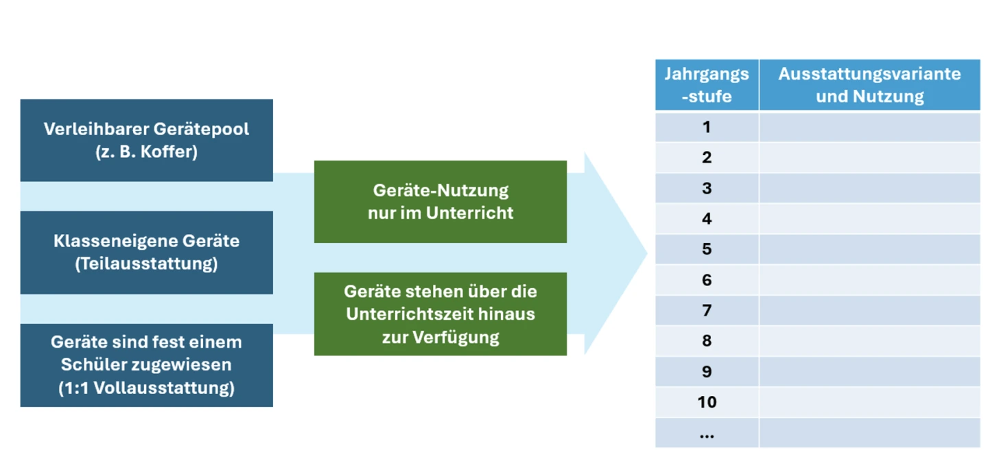 Jede Klasse verfügt über eine bestimmte Anzahl von schulischen Geräten, die ihr zugeordnet sind. In der Praxis hat sich eine Mindestausstattung von einem halben Klassensatz plus drei Ersatzgeräten bewährt.