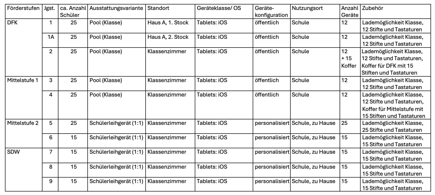 Für die Klassen 1-4: Wir planen feste Geräte in den Klassenräumen sowie Koffer zum Ausleihen. Die Geräte sind nicht personalisiert und mit Stift und Tastatur ausgestattet. In jedem Klassenraum sind stets sechs Geräte vorhanden, was der Hälfte der Klassenstärke entspricht. Der Rest kann ausgeliehen werden. Alle Geräte werden durch ein Mobile Device Management (MDM) verwaltet. Zudem gibt es in den Klassenräumen Lademöglichkeiten, und die Geräte werden in Schränken aufbewahrt.