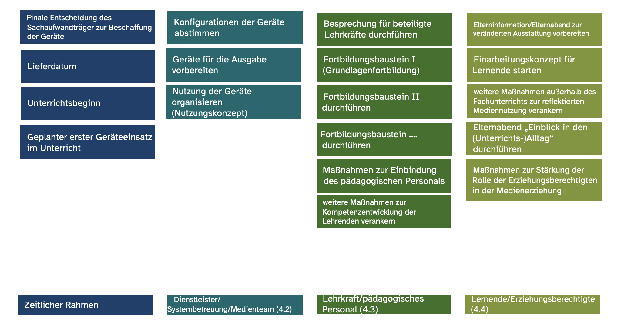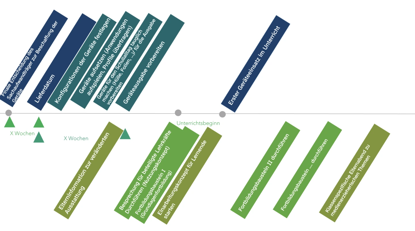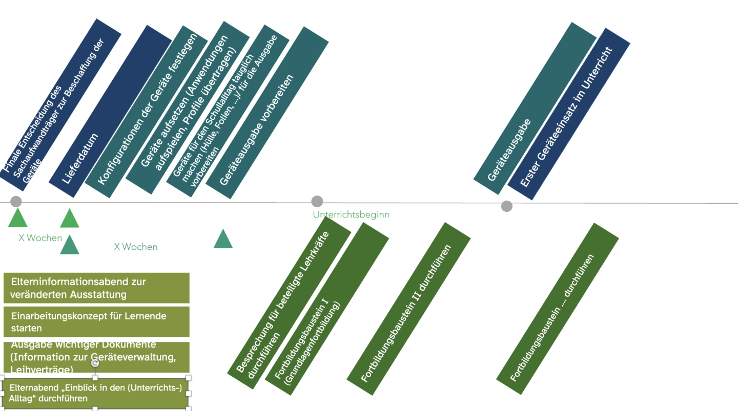 Zuerst wird eine geeignete Darstellungsform der notwendigen Aufgabenfelder ausgewählt. Fehlende Bausteine können vorab ergänzt und unpassende verworfen werden. Eine Vorauswahl ist in den analogen Karten bzw. der Präsentationsvorlage zu finden, wobei diese an den gewählten Weg der Schule anzupassen ist. Eine farbliche Zuordnung (hier: Klassen- bzw. Personalplanung, Gerätebeschaffung, Vorbereitung und Einbindung der Lehrkräfte, Elternkommunikation) erleichtert die Verortung auf der Zeitleiste.