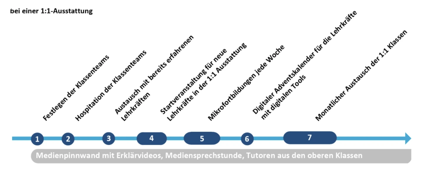 Danach werden alle weiteren Maßnahmen im Rahmen des Handlungsfelds „Digitale Expertise stärken“, wie etwa die Fortbildungsbausteine für das Kollegium, eingefügt. Das „Einarbeitungskonzept für Lernende“ sollte zeitlich eng an die Geräteausgabe geknüpft sein. Ebenso der „Elternabend: Einblick in den (Unterrichts-)Alltag“.