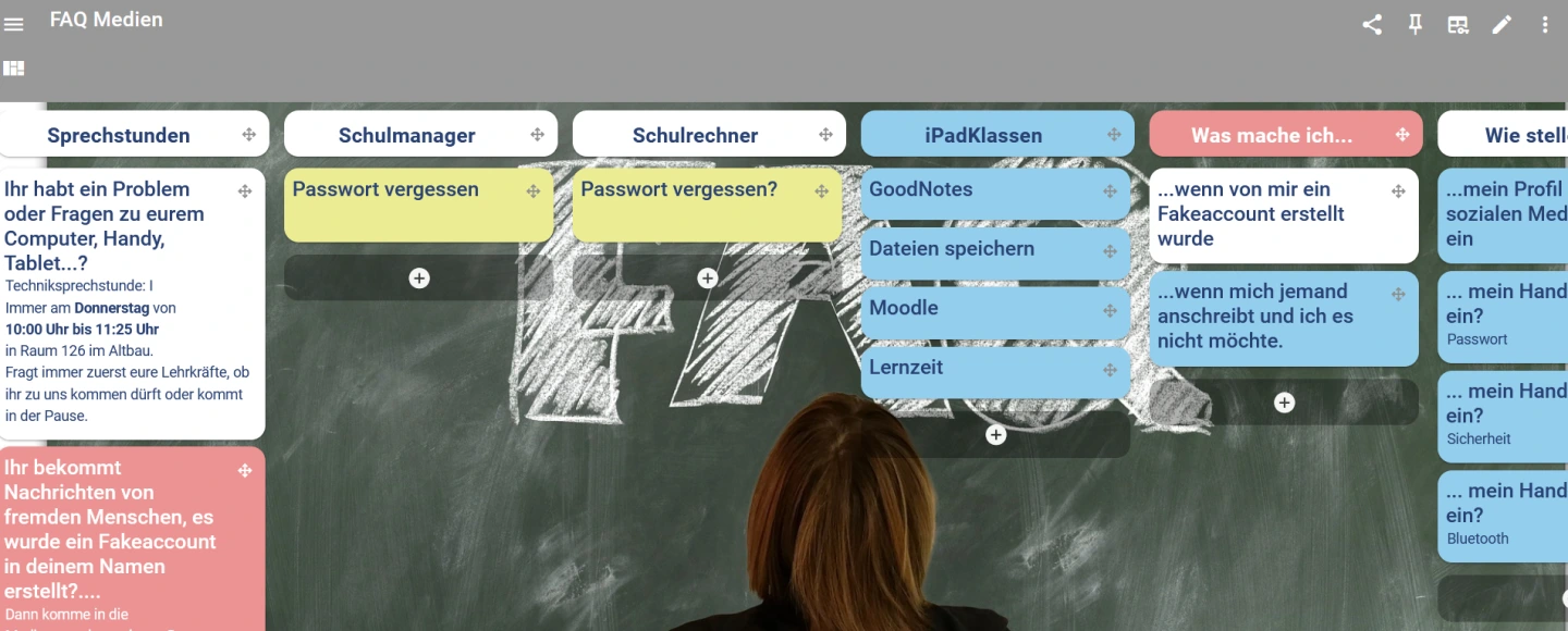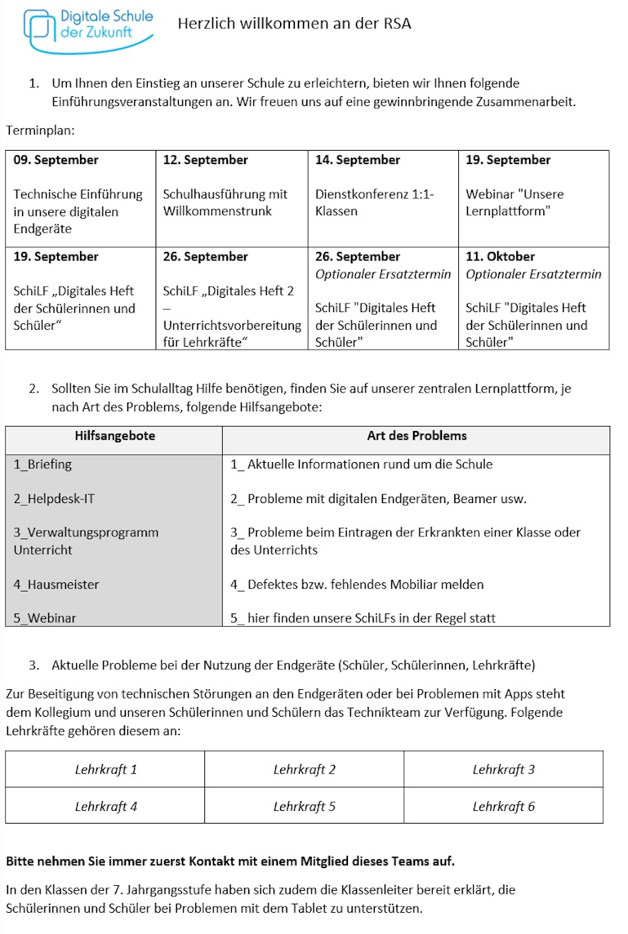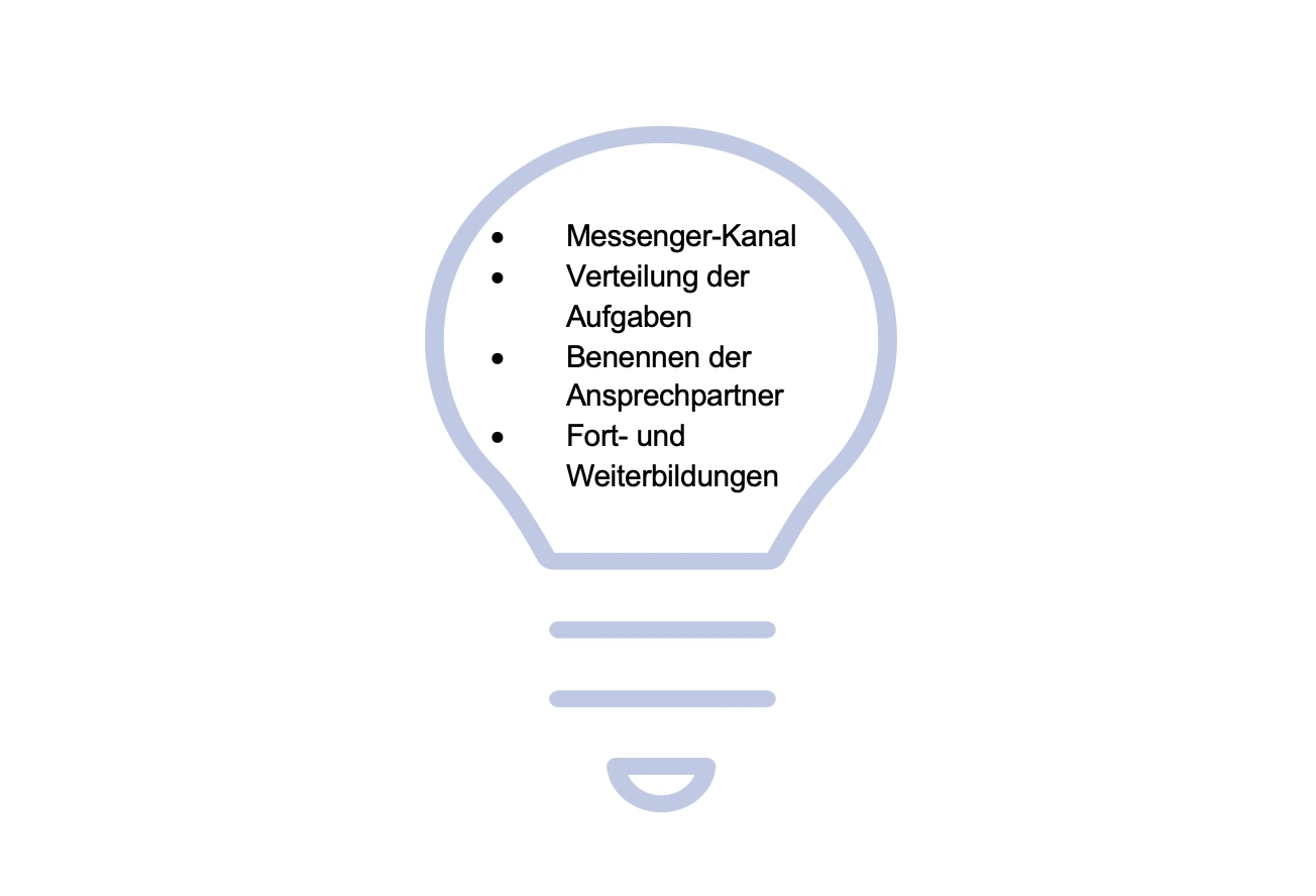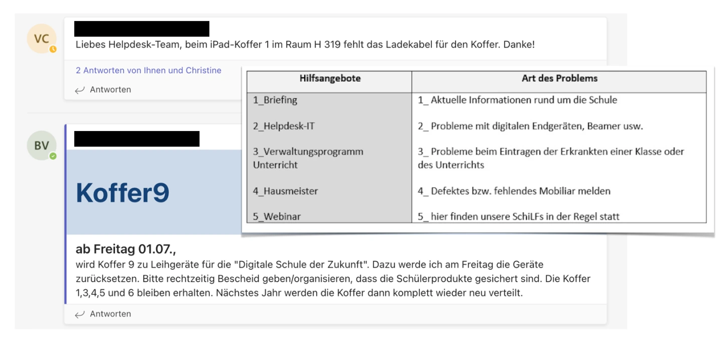 Die Schule entwickelt konkrete Lösungsvorschläge. Im Bereich der Technik ermöglicht beispielsweise die Einrichtung eines Messenger-Kanals für die Beteiligten kürzere Kommunikationswege. Weiter- und Fortbildungen schaffen Sicherheiten. Sinnvoll ist auch eine konkrete Festlegung bzw. Anpassung der Verteilung der Zuständigkeiten.