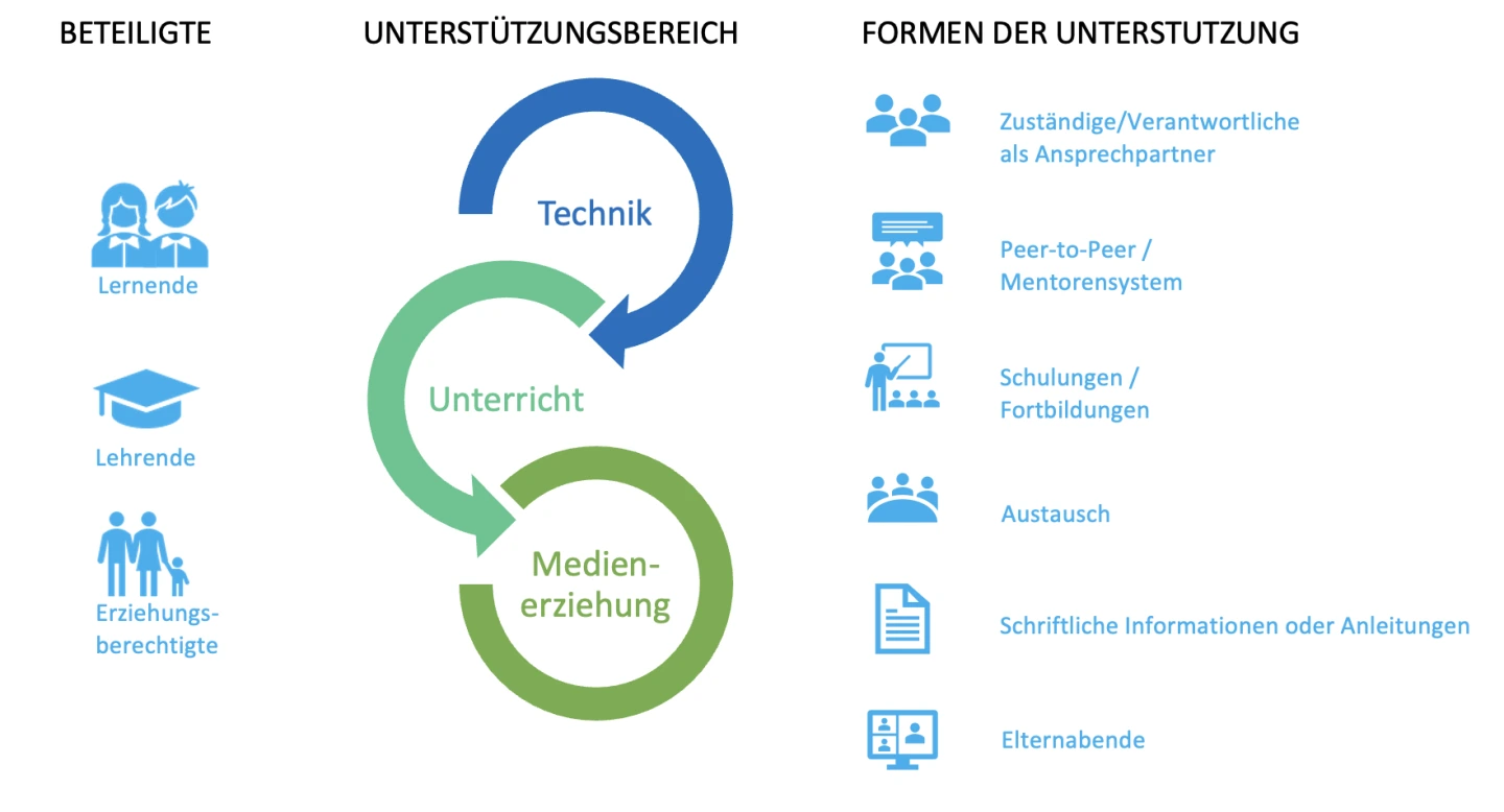 Damit das Lernen und Lehren mit mobilen Endgeräten gelingen kann, ist es sinnvoll, dass die Verantwortlichen und die am Prozess Beteiligten gemeinsam Unterstützungsangebote etablieren. In diesem Artikel wird eine Möglichkeit zur Erarbeitung von Maßnahmen mit passenden Beispielen vorgestellt.