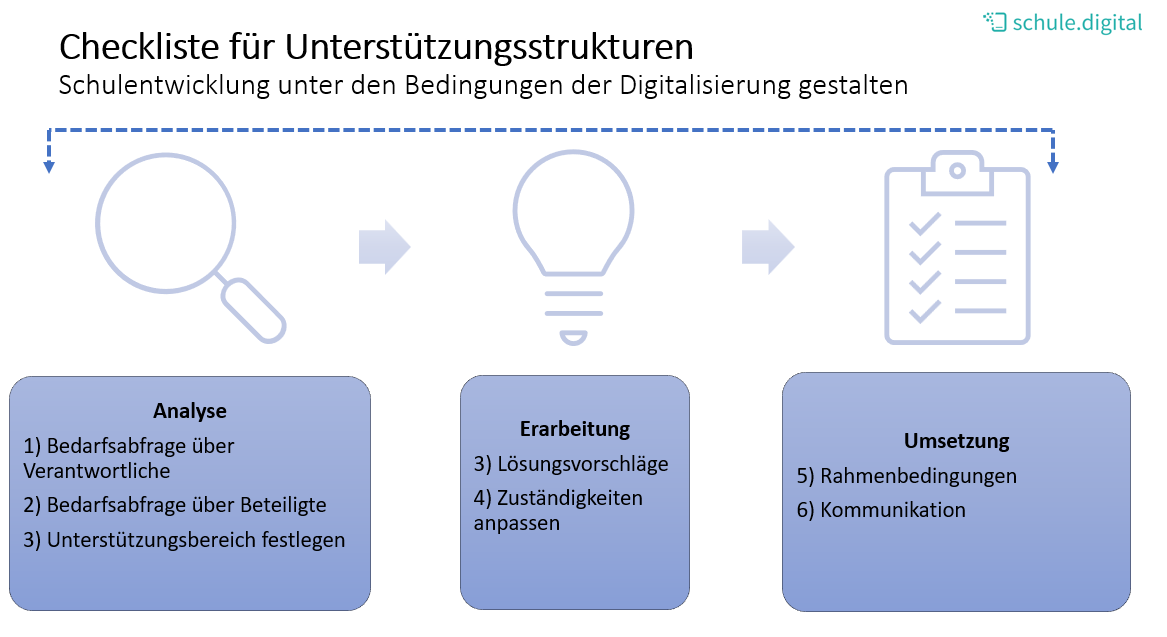 In einem nächsten Schritt müssen die Arbeits- und Rahmenbedingungen so angepasst werden, dass die Lösungsmaßnahmen optimal greifen können. Die Liste der Ansprechpartner wird an die Elternschaft und das Kollegium kommuniziert, Termine der Techniksprechstunden weitergegeben und beispielsweise auf der Schulhomepage vermerkt. Die Verantwortlichen planen und terminieren Fort- und Weiterbildungen, angepasst an den Jahresplan der Schule.
