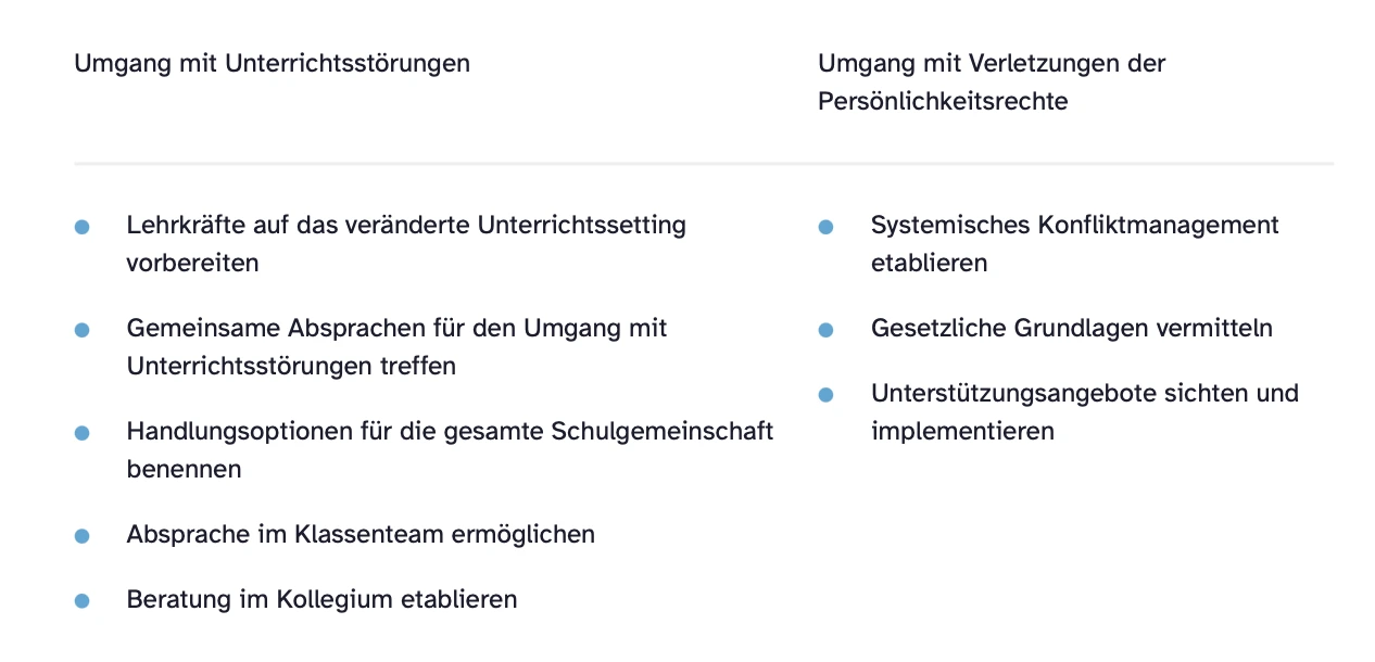 Schulen brauchen deshalb ein institutionell verankertes Konfliktmanagement, das Klarheit und Souveränität sowie einen professionellen Umgang mit Situationen wie übler Nachrede im Netz, (Cyber-)Mobbing und allen anderen Gefahren im Netz gewährleistet.