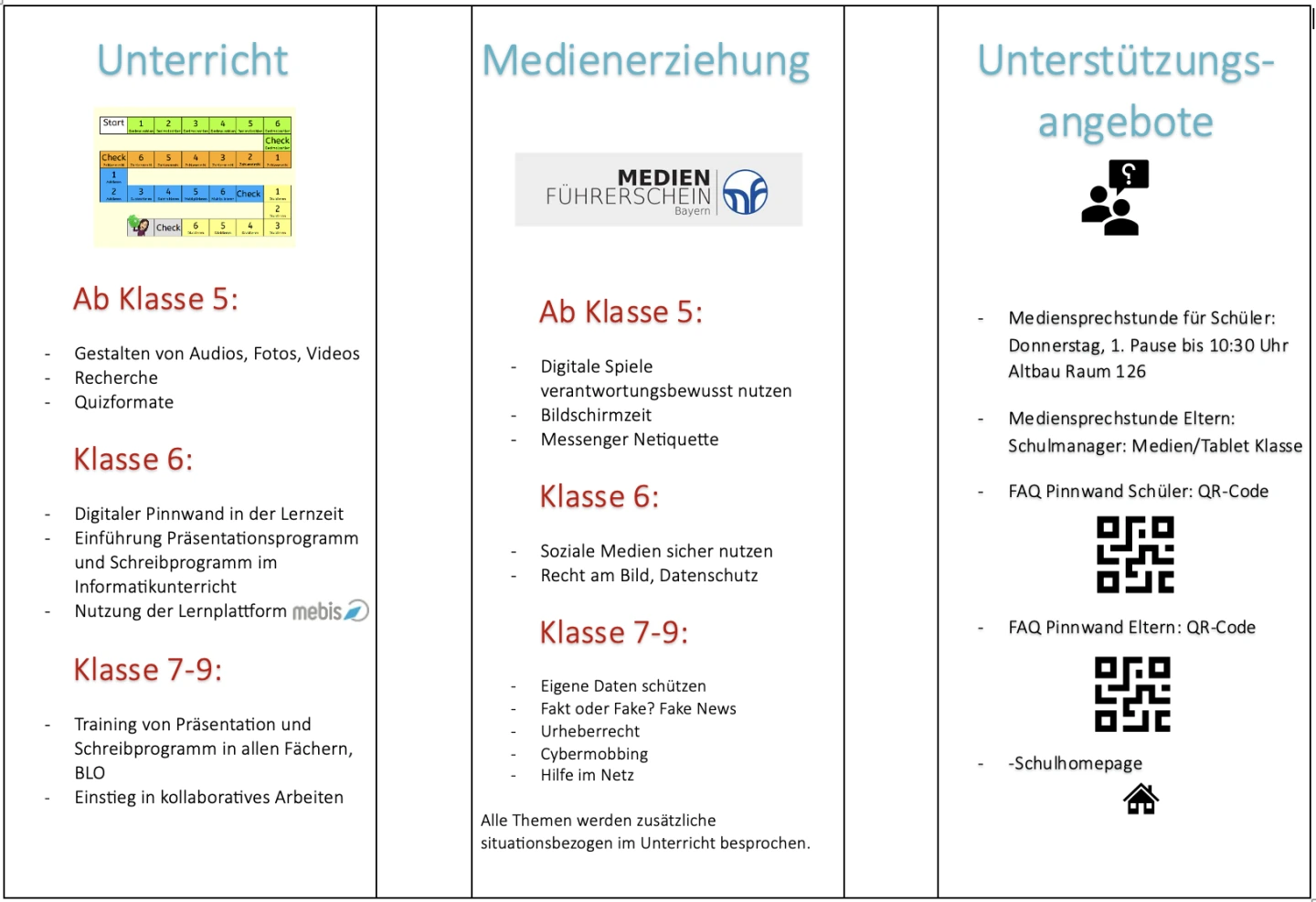 Um sowohl der Schulfamilie als auch weiteren Interessierten einen Überblick über das jahrgangsstufenübergreifende Konzept zu ermöglichen, eignet sich unter anderem die kompakte Darstellungsweise eines Flyers und die Veröffentlichung an geeigneter Stelle auf der Schulhomepage.