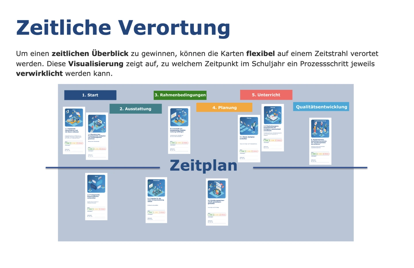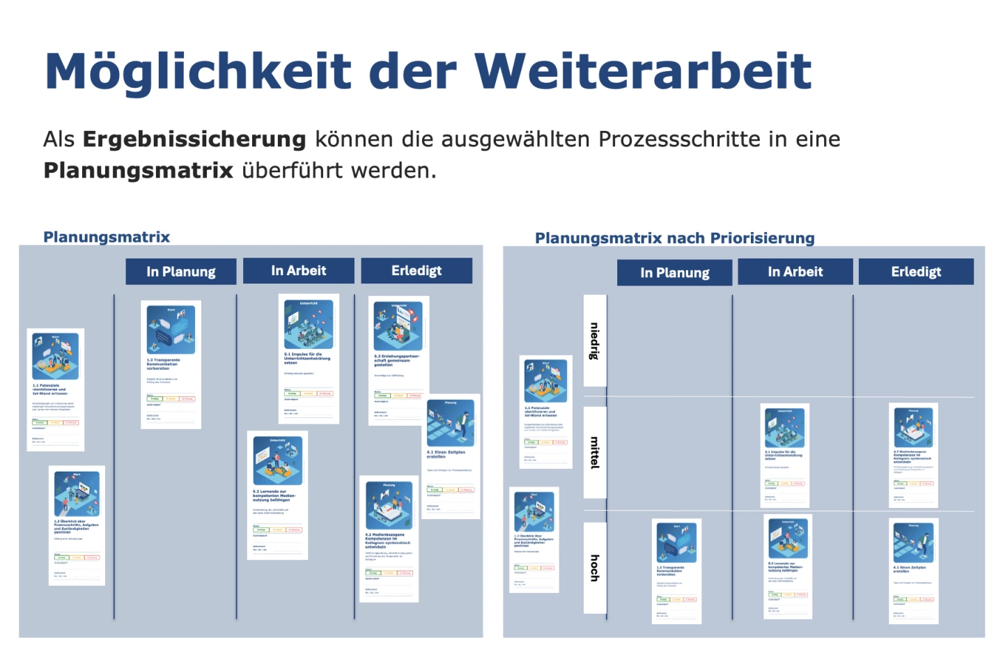 Eine Prozessplanung besteht aus vielen Einzelschritten, die gemeinsam identifiziert, priorisiert und umgesetzt werden müssen. Das vorliegende Material stellt neben dem Kartenset eine weitere Visualisierungsmöglichkeit vor, wie ein konkreter Planungsprozess angegangen werden kann.