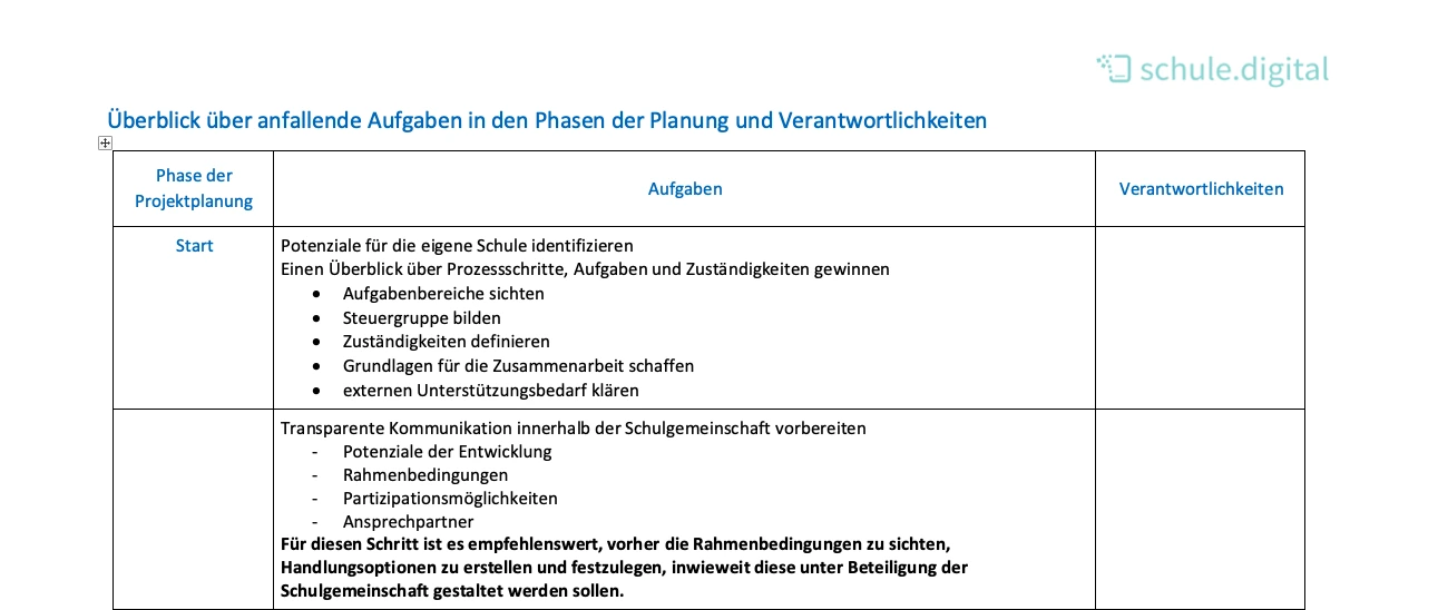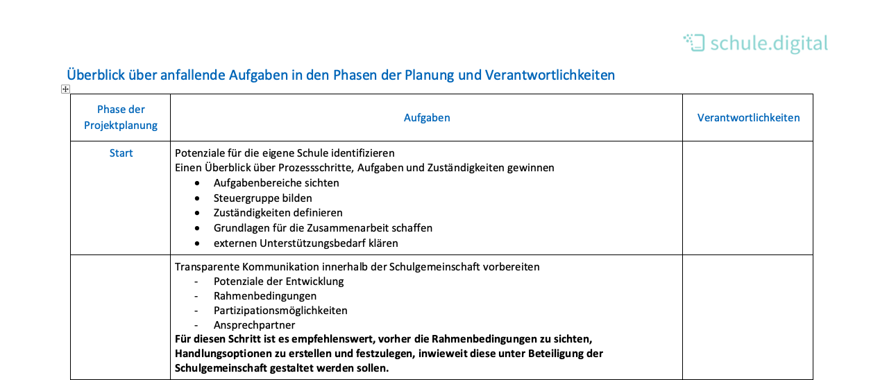 Innerhalb der genannten Arbeitsbereiche können nun unter Berücksichtigung vorhandener und benötigter Ressourcen Verantwortlichkeiten für die Aufgaben festgelegt und zuständige Personen benannt werden. Mit folgender Tabelle bietet Ihnen diese Handreichung einen hilfreichen Überblick über Aufgaben und Verantwortlichkeiten, zugeordnet zu den jeweiligen Phasen des Prozesses – vom Start bis hin zur endgültigen Umsetzung.