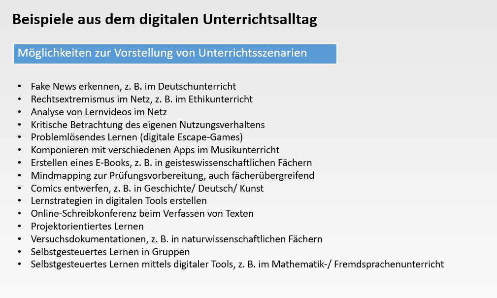 Die Einführung von mobilen Endgeräten eröffnet viele neue Möglichkeiten im Unterricht. Die Erziehungsberechtigten haben häufig nur eine vage Vorstellung davon, wie digitale Medien in Schulen genutzt werden, um Lernprozesse zu fördern. Folglich bietet es sich im Rahmen eines Elternabends an, Einblicke in konkrete Unterrichtssituationen zu geben, bei denen digitale Endgeräte zum Einsatz kommen.