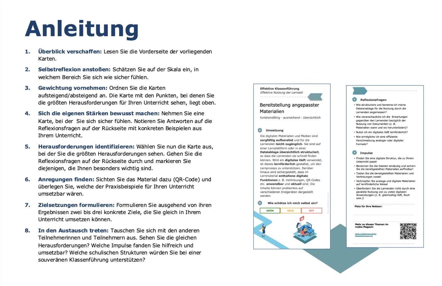 Aus den veränderten Anforderungen an die Lehrkräfte im Bereich der Klassenführung ergeben sich zahlreiche Bereiche (Materialien bereitstellen, Workflow mit den Lernenden einüben etc.), in denen sie verschiedene Fertigkeiten, Fähigkeiten sowie Einstellungen und Wissen erwerben müssen und dabei Unterstützung benötigen. Diese Unterstützung sollte den Lehrkräften möglichst frühzeitig in geeigneten Fortbildungsformaten vermittelt werden.