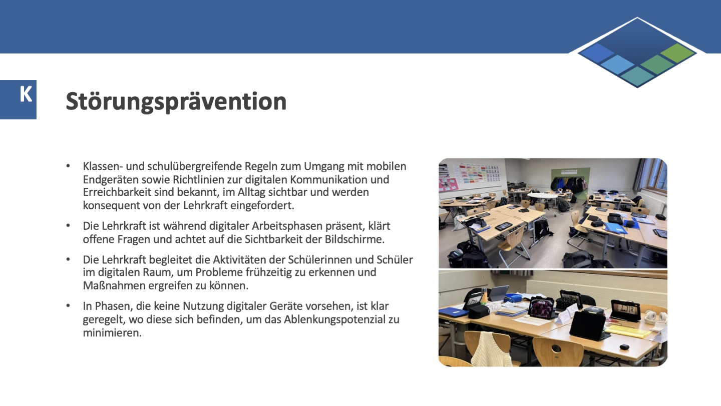 Präventive Maßnahmen für einen bewussten Umgang mit dem Ablenkungspotenzial digitaler Medien werden in die Unterrichtsplanung und -gestaltung integriert. Regeln in den Bereichen digitale Kommunikation, Arbeitsweise und Erreichbarkeit werden konsequent und angemessen umgesetzt.