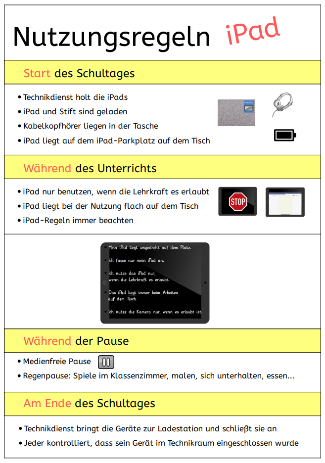 „Innerhalb der Schulfamilie wurden verbindliche Regeln zur Nutzung der Tablets vereinbart, welche auch von allen Schülerinnen und Schülern sowie deren Eltern beim Start der Arbeit mit den Endgeräten unterschrieben werden müssen. Um die wichtigsten Punkte für den Unterricht bei den Lernenden immer präsent zu haben, wurden die Regelungen als Plakate in allen Räumen der Schule aufgehängt.“
