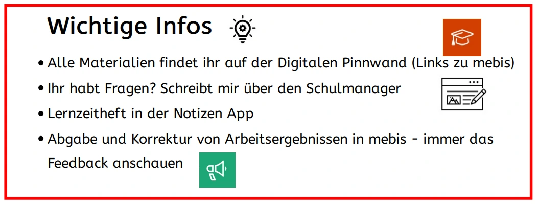 „Während ich am Anfang der Unterrichtsstunde immer noch selbst mit der Herstellung der Technik, der Überprüfung der Anwesenheit etc. beschäftigt bin, sollen alle Schülerinnen und Schüler die Zeit nutzen, sich am Gerät und der Plattform anzumelden. An der Tafel visualisieren Bildkarten welcher Ordner und welches Tool in der Stunde benötigt werden. . Am Anfang muss man sie noch häufig daran erinnern, irgendwann läuft es automatisiert ab.“