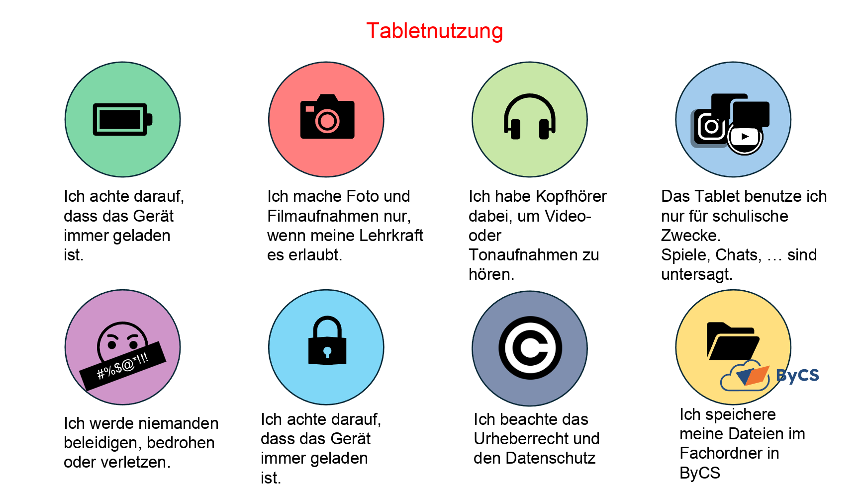 „Unsere Tabletnutzungs- und Verhaltensregeln hängen im Klassenzimmer. Treten Probleme auf, verweise ich immer auf die vereinbarten Regeln. Häufig ist, dass die Geräte nicht ausreichend geladen sind oder die Kopfhörer vergessen wurden. Dafür gibt es ‚einen Strich‘ Zusätzlich zu den allgemein geltenden Schulregeln, gilt in meinem Unterricht, dass man sein Tablet beim Anhören von Audios nur mit Kopfhörer verwenden darf. Alle Schülerinnen und Schüler besitzen mit ihrem Namen versehene kabelgebundene Kopfhörer, die sie über die gesamte Schulzeit nutzen. . Ich erwarte von den Schülerinnen und Schüler Kopfhörer als Grundausstattung immer dabei zu haben. Für Partner- und Gruppenarbeiten haben wir Adapter zum gemeinsamen Anhören der Audios im Klassenzimmer.”