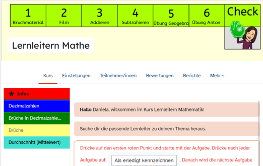 „Am Ende meiner Unterrichtsvorbereitung in der mebis Lernplattform wechsle ich immer in die Schülerrolle und kontrolliere, ob Alles auf den verfügbaren Geräten funktioniert (Ton abgespielt wird, Links funktionieren, Downloads funktionieren,...) und die Navigation klar und einfach ist. .Auf diese Weise kann ich technische Probleme frühzeitig erkennen und vermeiden, dass sie den Unterrichtsablauf stören.“